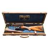 SHOTGUN WITH CASE & ACCESSORIES. Cal. 20 ga. 2 3/4". S# 14129. Bbl. 26", marked for WS-1 & WS-2. Steel front & mid beads. Blued boxlock action. Floorplate is marked "SKEET". Selective ejectors & single selective trigger. Beavertail forearm w/ kidney pattern checkering. Uncapped pistol grip stock of nicely crotch figured walnut measures 13 7/8" over leather faced brown Pachmayr pad. DAC: 1 1/2"+. DAH: 2 3/8". Neutral cast. Bore diameter: Rt .613 Lt .613. Choke constriction: Rt .009 flare (Skeet 1). Lt .007 (Skeet 2). Minimum wall thickness: Rt 028. Lt .029. WEIGHT: 6 lbs, 11 oz. UNATTACHED ACCESSORIES: gun is housed in high quality oak & leather case w/ stitched leather corners in leather trimmed gray canvas outer cover. Interior is lined in blue suede and has WRA label in lid. Bottom compartment is semi-French fitted and contains brass oil bottle, snap caps and striker bottle. A 3 piece rosewood cleaning rod is in leather case. Brushes etc. are in black leather wallet. 2 keys are present. CONDITION: bbls. & action retain over 95% reblued finish. Wood finish shows light wear w/ scattered scratches & marks. Action is tight & on face. Very good bright bores. Case is excellent. Outer cover shows some rubs. (24-5872/DS). CURIO. $5,000-7,000.