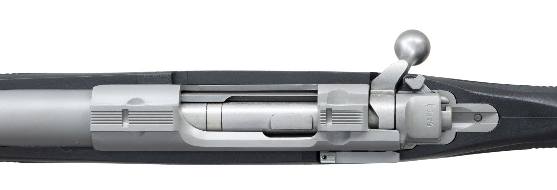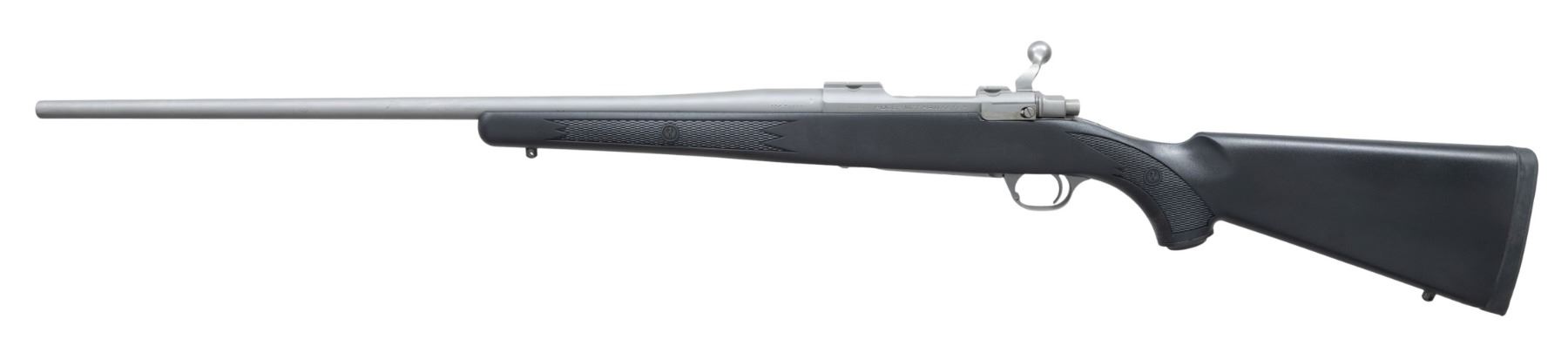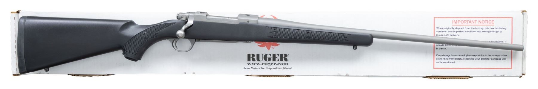 STAINLESS ACTION RIFLE WITH MATCHING FACTORY BOX. Cal. 204 Ruger. S# 712-00657. Shipped 2014 as Catalog # HKM77RFP; Model 07114. Bbl. 24". Matte stainless steel finish. Control feed action w/ claw extractor, integral ring grooves & matching numbered bolt. Floorplate has laser engraved Ruger emblem. Checkered black synthetic stock w/ sling studs, Ruger grip cap & red pad. UNATTACHED ACCESSORIES: matching numbered box containing lock, Ruger rings & paperwork. CONDITION: all aspects near excellent. (24-3348/MD). MODERN. $400-600.