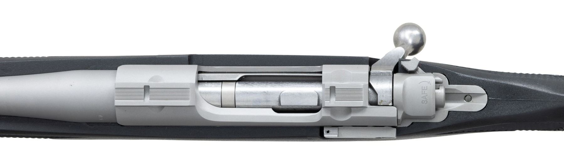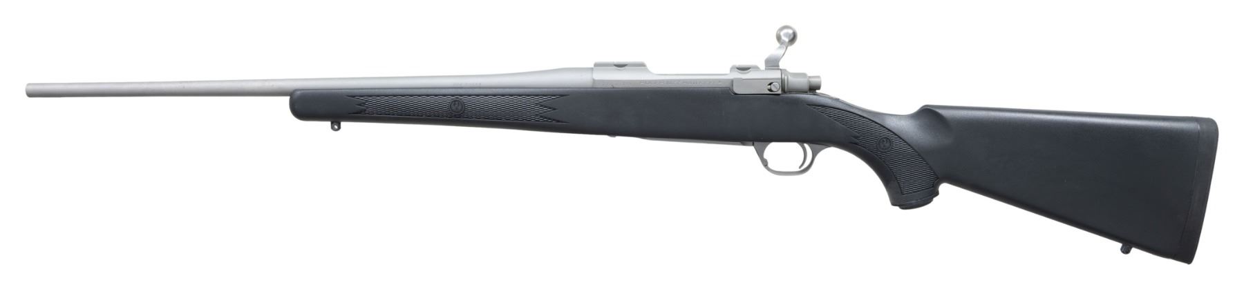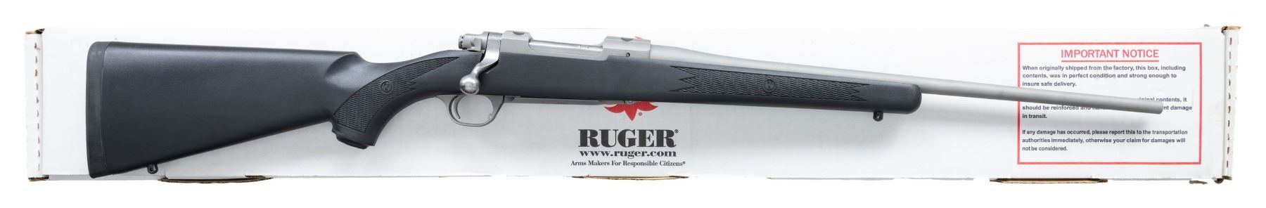 WEATHER ULTRA-LIGHT BOLT ACTION RIFLE WITH MATCHING FACTORY BOX. Cal. 204 Ruger. S# 712-23126. Shipped 2017 as Catalog # HKM77RLFP; Model 17124. Bbl. 20". Matte stainless finish. Control feed action w/ claw extractor, integral ring grooves & matching numbered bolt. Floorplate has laser engraved Ruger emblem. Checkered black synthetic stock w/ sling studs, Ruger grip cap & red pad. UNATTACHED ACCESSORIES: matching numbered box containing lock, Ruger rings & paperwork. CONDITION: all aspects near excellent. (24-3333/MD). MODERN. $400-600.