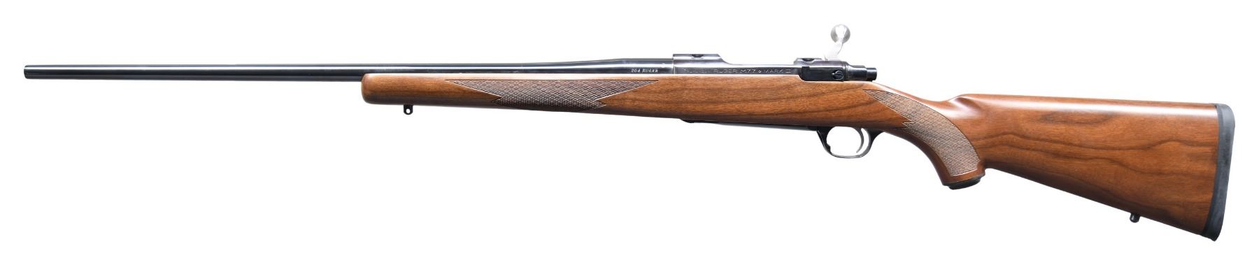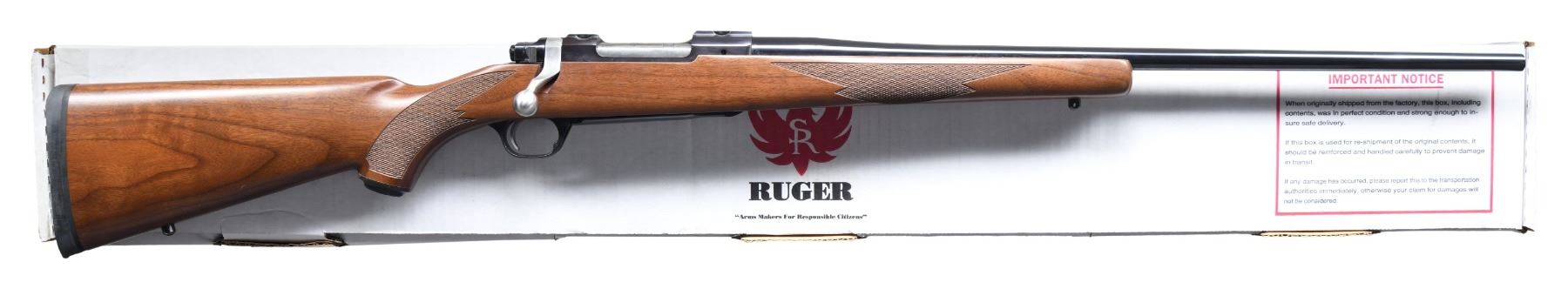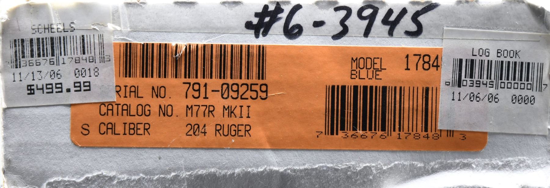 ACTION RIFLE WITH MATCHING FACTORY BOX. Cal. 204 Ruger. S# 791-09259. Mfg. 2006 as Catalog # M77R MKII; Model 17848. Bbl. 24". Blued finish. Short action w/ integral ring grooves, claw extractor & matching numbered bolt. Checkered walnut stock w/ sling studs, Ruger grip cap & black pad. UNATTACHED ACCESSORIES: matching factory box w/ Ruger rings, lock & paperwork. CONDITION: all aspects near excellent. (24-3398/MD). MODERN. $400-600.