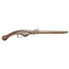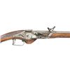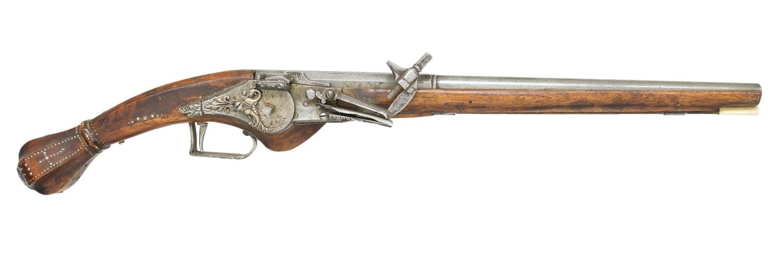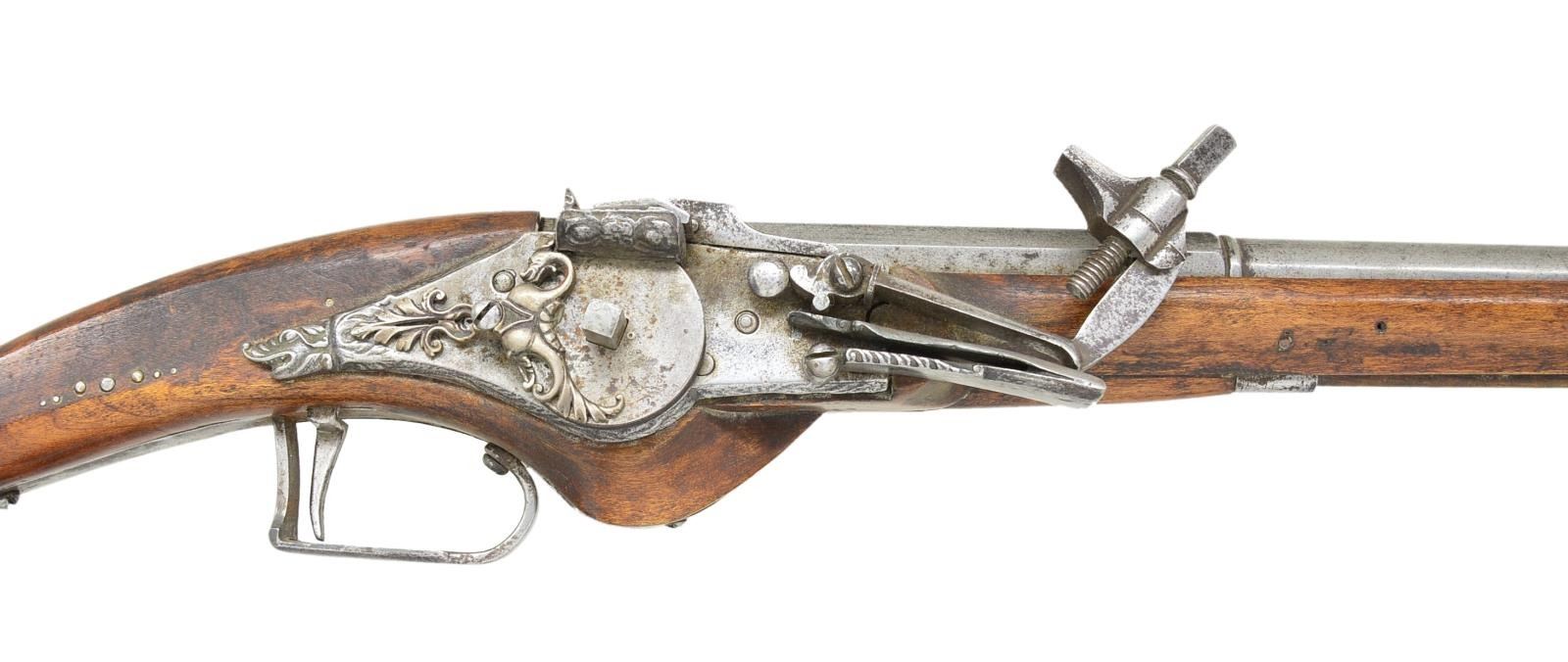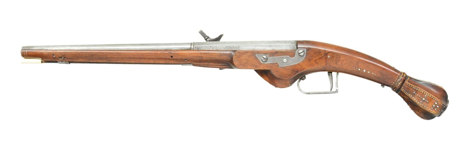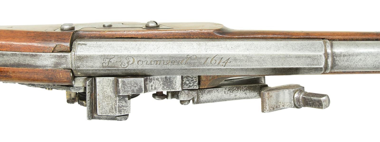 POUMEROL WHEELLOCK PISTOL. Cal. 49. NSN. Wheellock w/ relief engraved dog's head on tail, floral engraved pan & dog spring w/ file decoration has added half rnd., half oct. bbl. engraved "F Poumeral 1614" on top flat. Lock wheel retaining piece appears to be of silver alloy & is relief cast w/ acanthus & mythological head decoration. Later walnut stock w/ faceted oct. ball butt is pinned to bbl. & has contemporary made steel furniture. Butt & portions of stock have brass & silver tack decoration. CONDITION: bbl., trigger guard & sideplate w/ aged gray patina. Iron parts of lock show minor loss from oxidation, some internal parts replaced. PROVENANCE: The Estate Collection of Gary Parietti. (01-19681/JS). ANTIQUE. $2,000-3,000.
