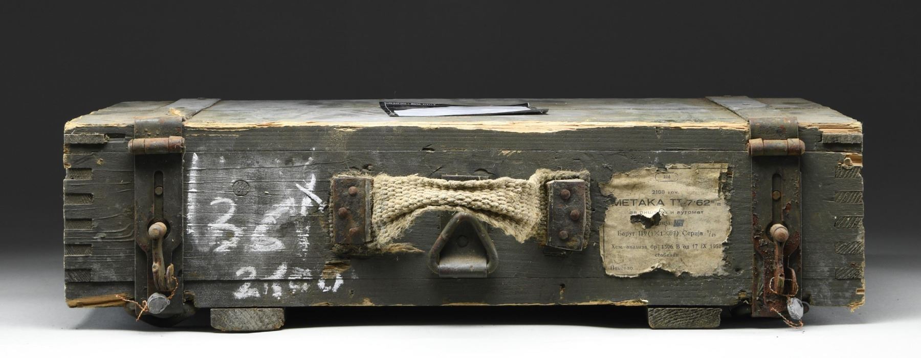 This lot consists of a sealed Yugo surplus 2100 rd. crate of 7.62x25 Tokarev ammo. Ammo is undoubtedly corrosive. CONDITION: sealed in arsenal crate. PROVENANCE: From the Estate of Ivan Lee Shapiro. (02-23495-7/MJC). AMMO. $400-600 for crate.