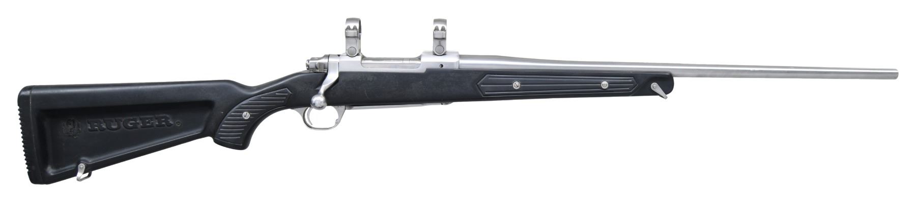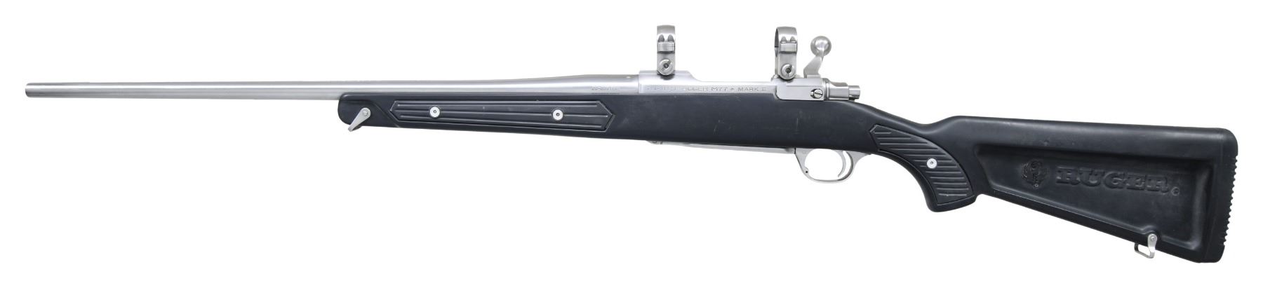 WEATHER STAINLESS BOLT ACTION RIFLE. Cal. .22-250. S# 784-31828. Mfg. 1996 as Catalog #KM77RFP; Model 7898. Distinctive "Boat-paddle" Du-Pont Zytel stock with stainless sling swivels, grooved grip panels & black pad. Stainless steel w/ 22" barrel. Short action with Ruger rings, claw extractor & matching numbered bolt. CONDITION: very good to near excellent overall appearance with light scratches on receiver & floorplate. Bright bore with strong rifling. (24-2842/MD). MODERN. $600-900.