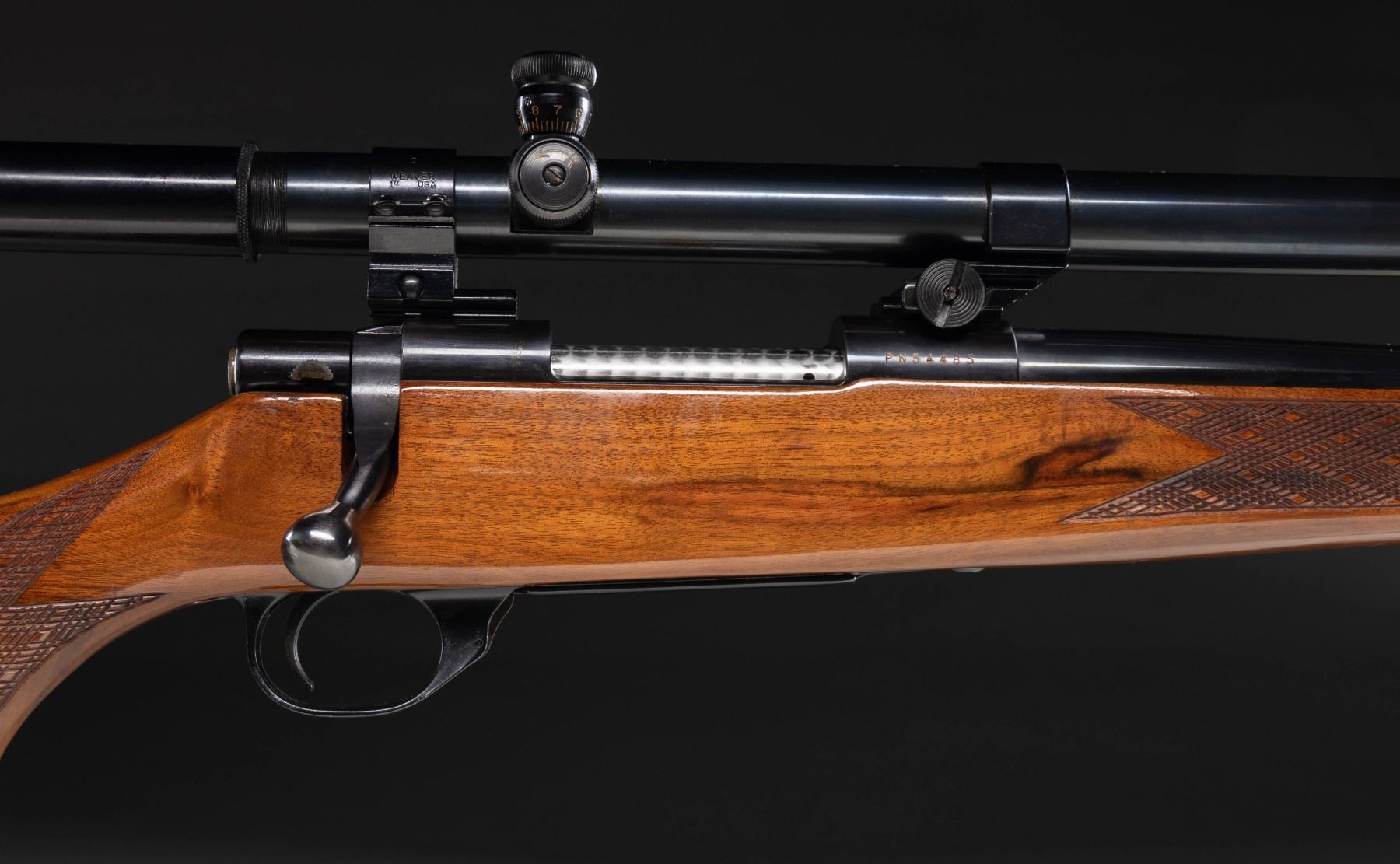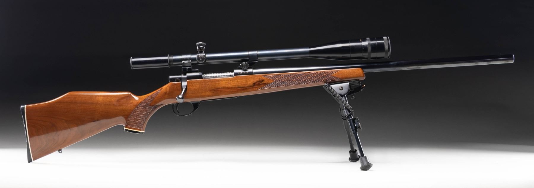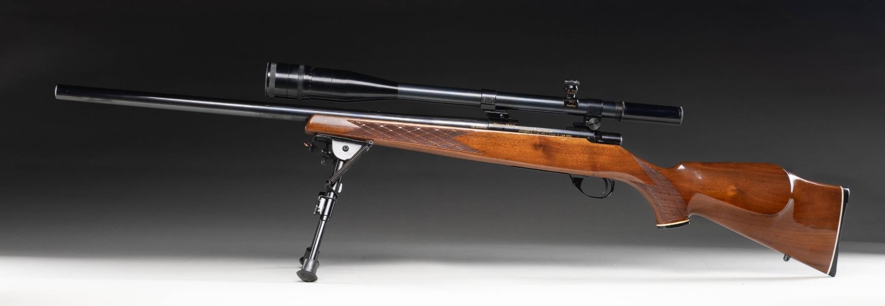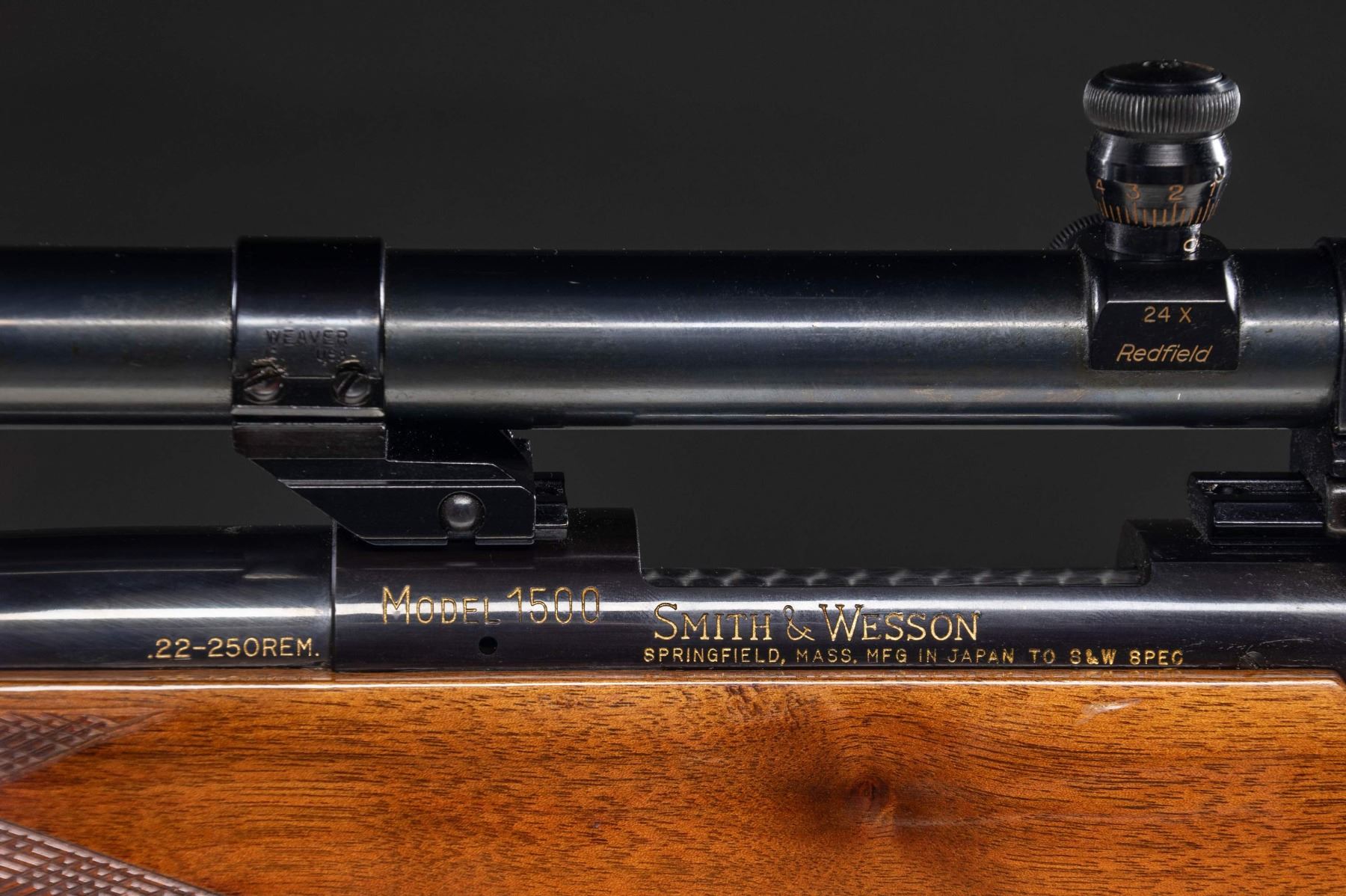 ACTION RIFLE WITH REDFIELD 24X SCOPE. Cal. 22-250. S# PN54485. Mfg. in Japan by Howa to Smith & Wesson's specifications. Tapered 24" barrel. Redfield fixed 24x target scope with fine crosshairs, scope caps, AO on Weaver 1" rings & bases. Push feed action has hinged floorplate & jeweling on bolt. Skip-line checkered Monte Carlo walnut stock w/ S&W buttplate & bipod. UNATTACHED ACCESSORIES: scope caps. CONDITION: very good to near excellent overall appearance showing light handling wear & marks. Very good rifling. Scope has very good finish with serviceable optics. (25-4816/MD). MODERN. $500-800.