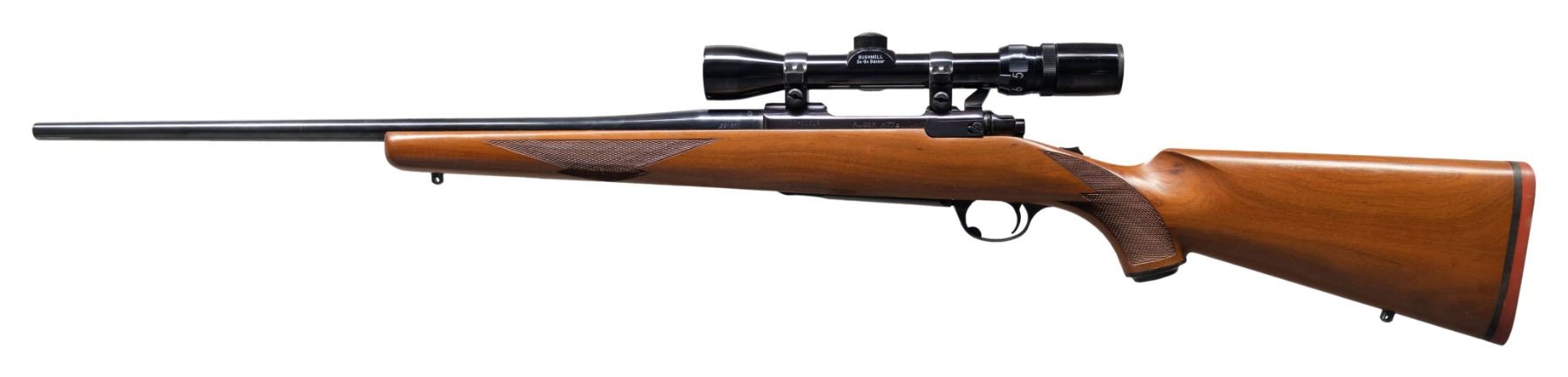 Cal. 22-250. S# 73-50813. Mfg. 1978 as M77R. Bbl. 22" w/ Warning marks. Bushnell Banner 3-9x32 duplex scope on Ruger rings & integral grooves. Short control feed action w/ matching numbered bolt & claw extractor. Checkered walnut stock w/ Ruger grip cap & red pad. CONDITION: very good to near excellent overall showing light handling marks. Very good bore. (25-4050/MD). MODERN. $500-800.