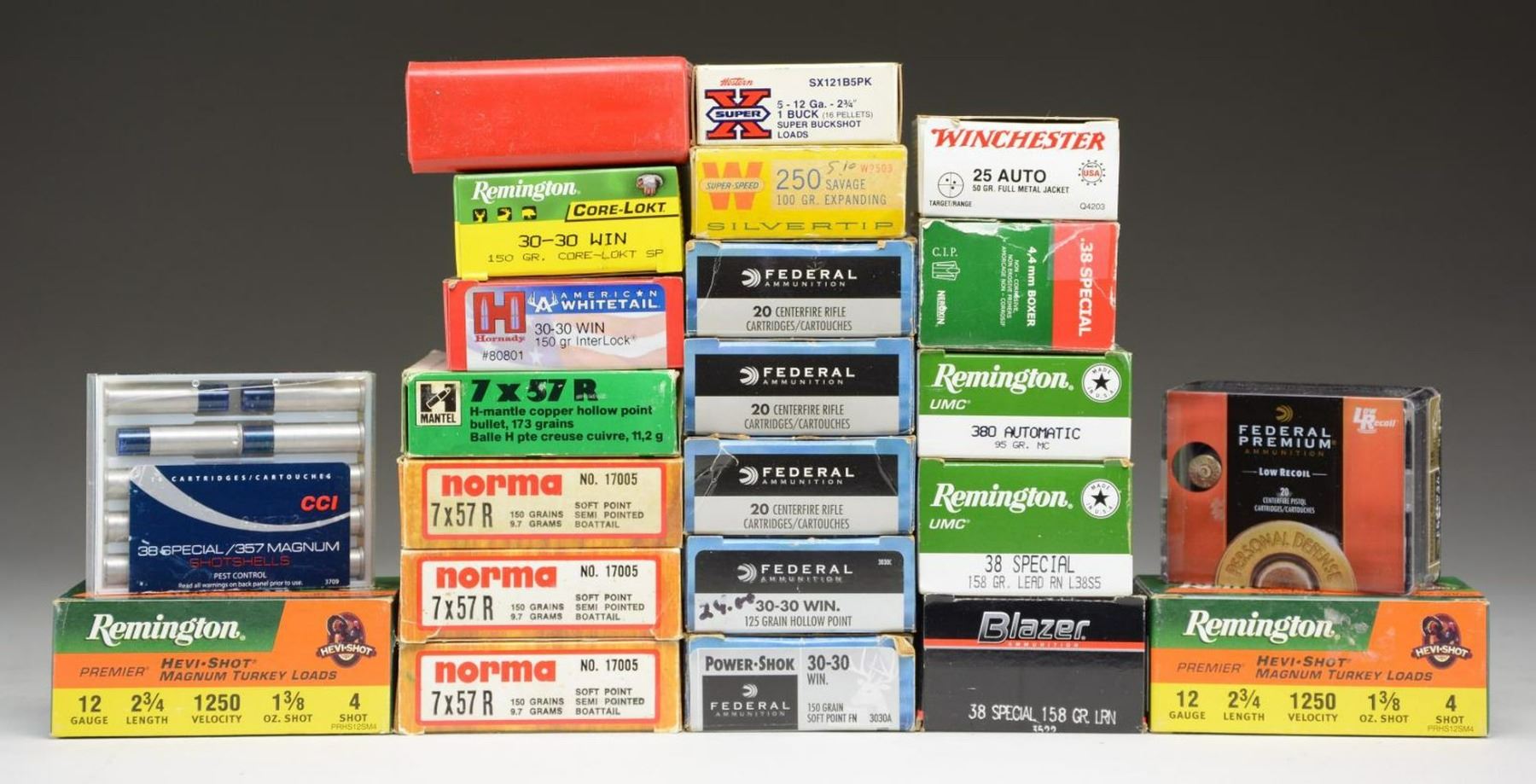 LOT CONTAINS HOLLOW POINT AMMUNITION. 30-30: 31 Rds. (5 BOXES) Remington 150 gr. core-lokt; boxes contains spent brass including 1 box of 20 spent cases. 13 RDS. (1 BOX) Hornady American Whitetail 150 gr. Interlock. 20 Rds. (1 BOX) Federal 125 gr. hollow point. 250 SAVAGE: 12 RDS. (1 BOX) Winchester Super-Speed 100 gr. Expanding Silvertip. 7x57R. 46 RDS. (3 BOXES) Norma 150 gr. Soft Point. 6 RDS. (1 BOX) RWS 173 gr. copper hollow point. 375 H&H: 11 Brass cases in red case. 12 Gauge, 2 3/4": 16 Rds. (2 BOXES) Rem. Premier Hevi-Shot Magnum Buffered Turkey loads. 1 3/8 oz. #4 5 RDS. (1 BOX) Western Super X 1 Buck. 38 SPL.: 7 Rds. (1 BOX) Blazer 158 gr. LRN. 7 Rds. (1 BOX) Federal 110 gr. hydra-shok. 44 Rds. (1 BOX) Sellier & Bellot 158 gr. SP. 10 Rds. (1 BOX) Rem. 158 gr. lead RN. 10 Rds. (1 BOX) CCI shot shells for 38 Spl. / 357 Mag. 380 ACP: 25 Rds. (1 BOX) Rem. 95 gr. MC. 25 ACP: 24 Rds. (1 BOX) Win. 50 gr. full metal jacket. CONDITION: boxes in good overall showing wear. Ammo appears serviceable. (02-20953/MD). $200-400.