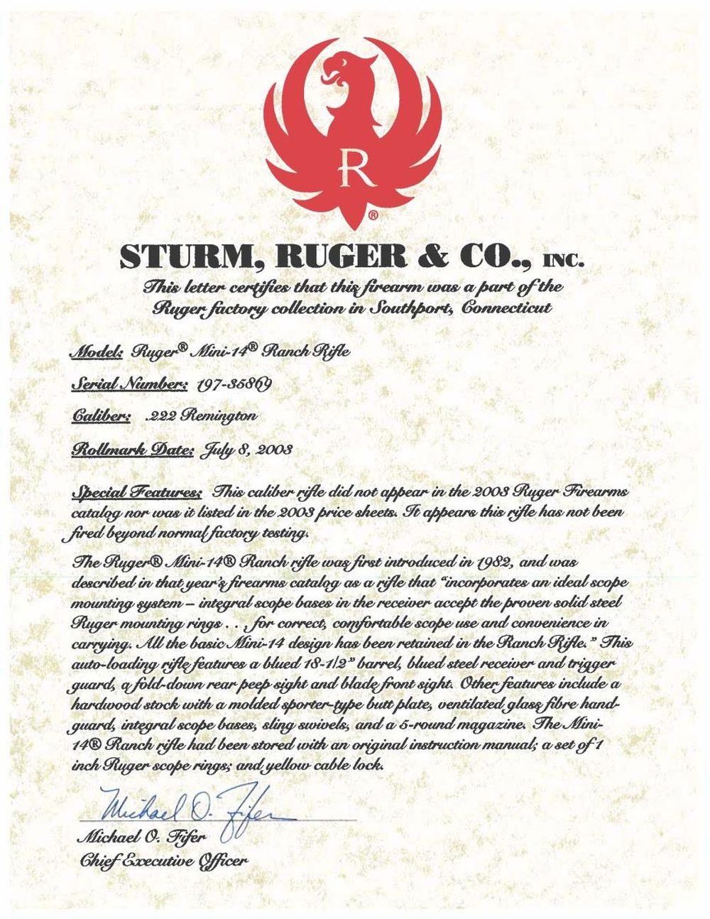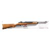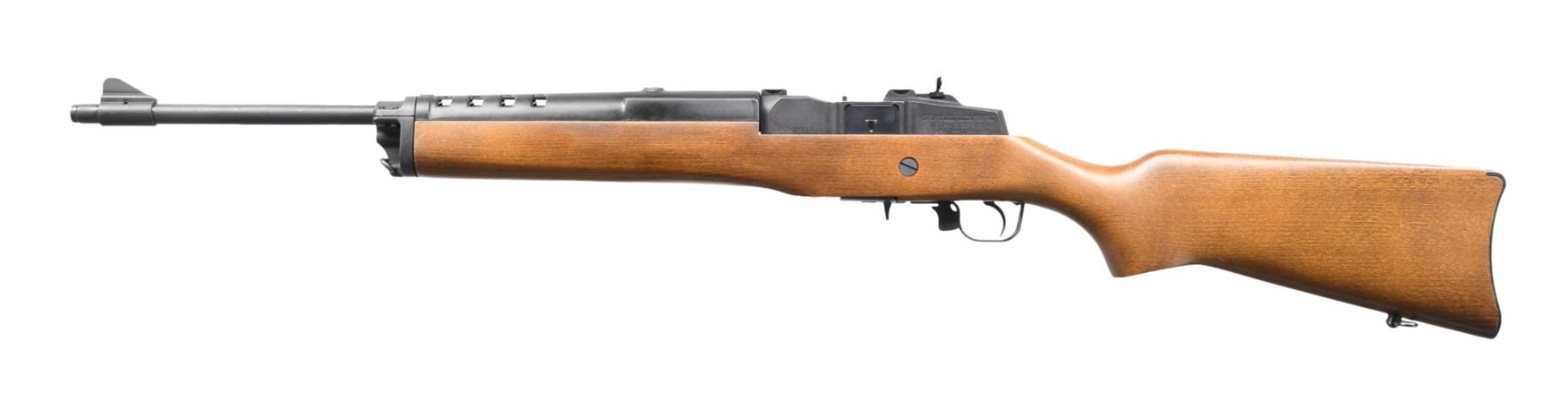 Cal. 222 Rem. S# 197-35869. Bbl. 18 1/2". Ramped blade front sight. Folding aperture rear sight. Matte blue finish. Unusual Mini 14 rifle in 222 Rem likely made for export to countries with restrictive gun laws. Catalog number: M14/5R/222. Mfg. 2014. Birch stock with bottom mounted sling swivels. MAGS: 1-5 rd. UNATTACHED ACCESSORIES: matching numbered factory box with manual, trigger lock & set of Ruger rings. CONDITION: all aspects near excellent. (23-6803/MJC). MODERN. $700-1000.