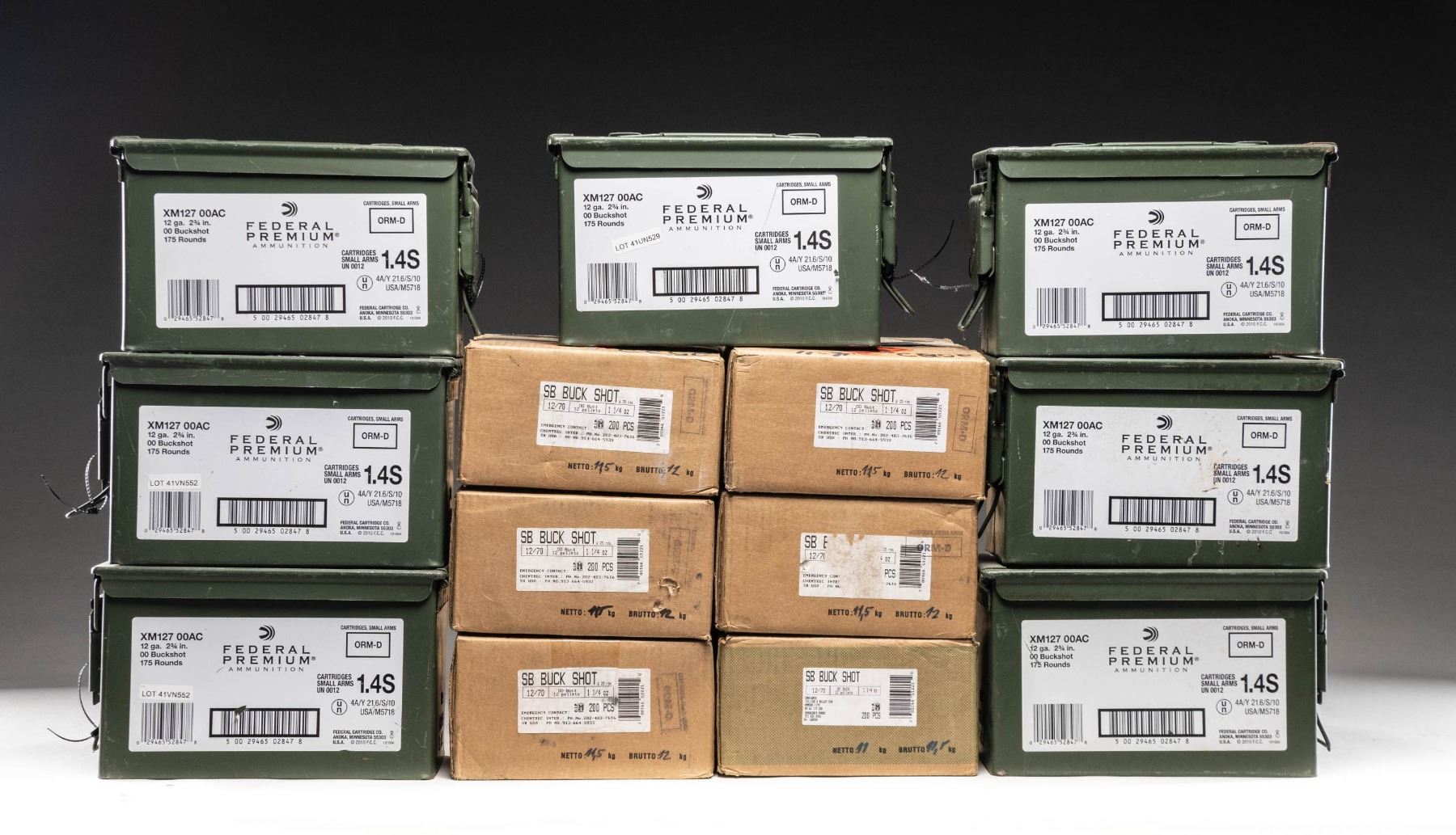 This lot consists of 2425 rds. of mixed brand 12 Ga. 00 Buck 2 3/4 shotshell. Ammo is mixed between Federal XM127 ammo in .50 Cal ammo cans & S&B ammo in 200 rd. packs. CONDITION: sealed in boxes. (02-25730/MJC). $900-1400 for lot.