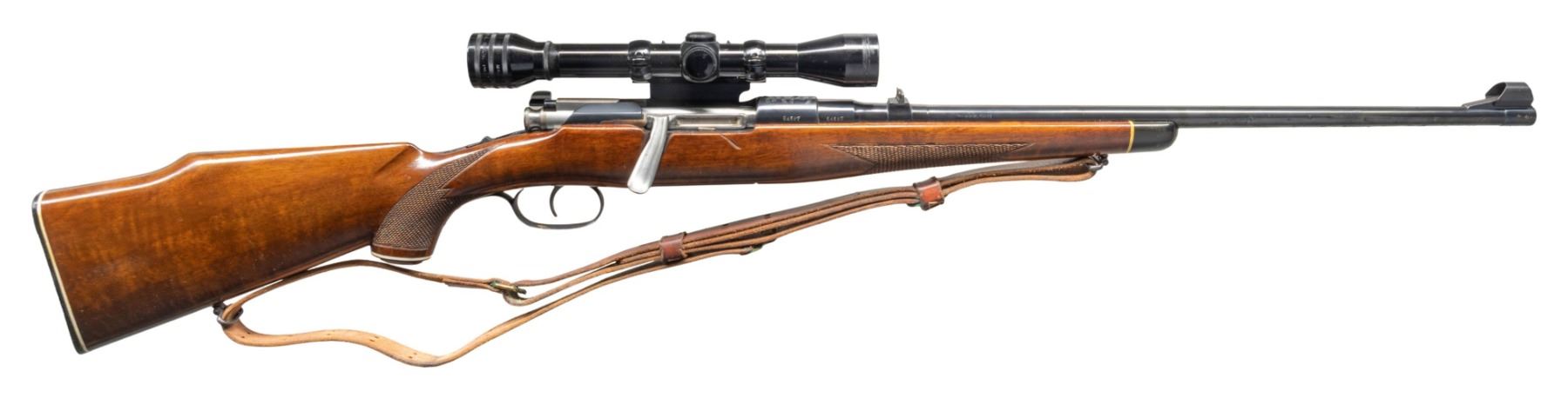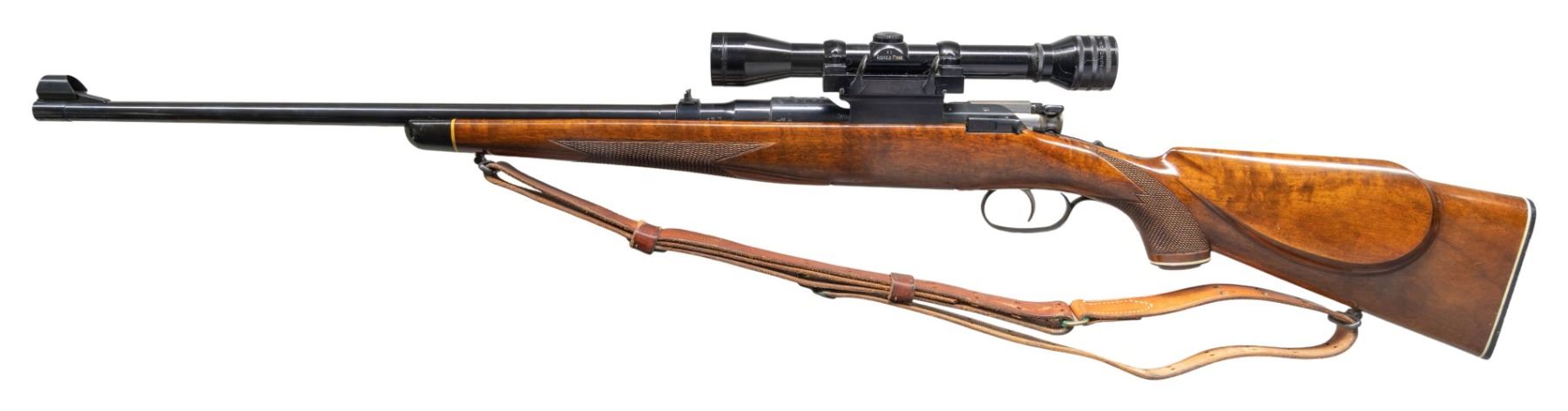 BOLT ACTION RIFLE WITH GRIFFIN & HOWE MOUNT. Cal. 243 Win. S# 54687. Mfg. 1966. Bbl. 22". Hooded bead front sight & island mounted 2 leaf rear sight. Griffin & Howe side mount holding vintage Redfield 4x tube, crosshair scope. Receiver D&T for scope bases & receiver sight. Single trigger. Checkered Monte Carlo walnut stock w/ black forearm tip, black synthetic grip cap & buttplate. Boyt brown leather sling on swivels. UNATTACHED ACCESSORIES: scope caps. CONDITION: good blue with some scratches on mag. floorplate & several spots of oxidation on bottom of barrel. Good wood finish with 1 large impression on right side near action & numerous small dings throughout & concentrated left side near action. Forearm tip has notable scuffing. Very good rifling. Scope has very good finish with serviceable optics. (25-4742/MD). CURIO. $600-900.