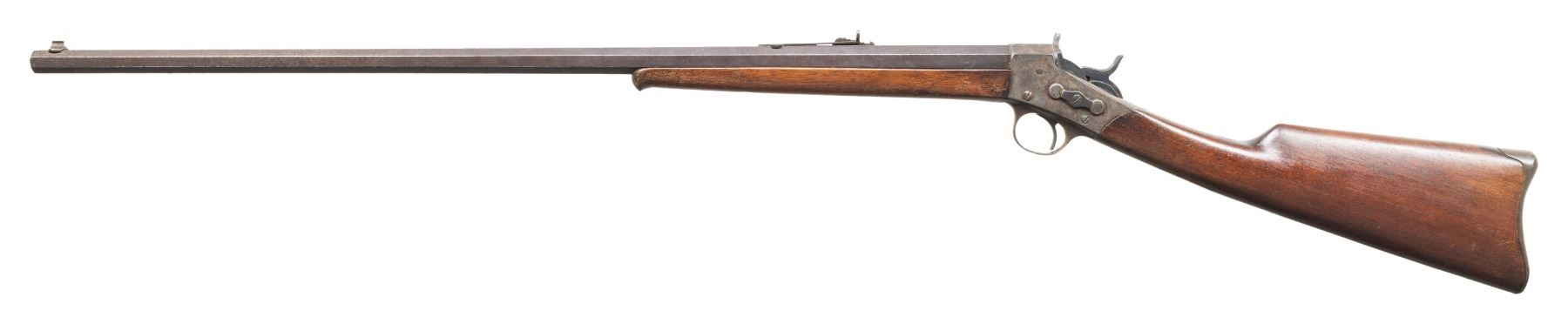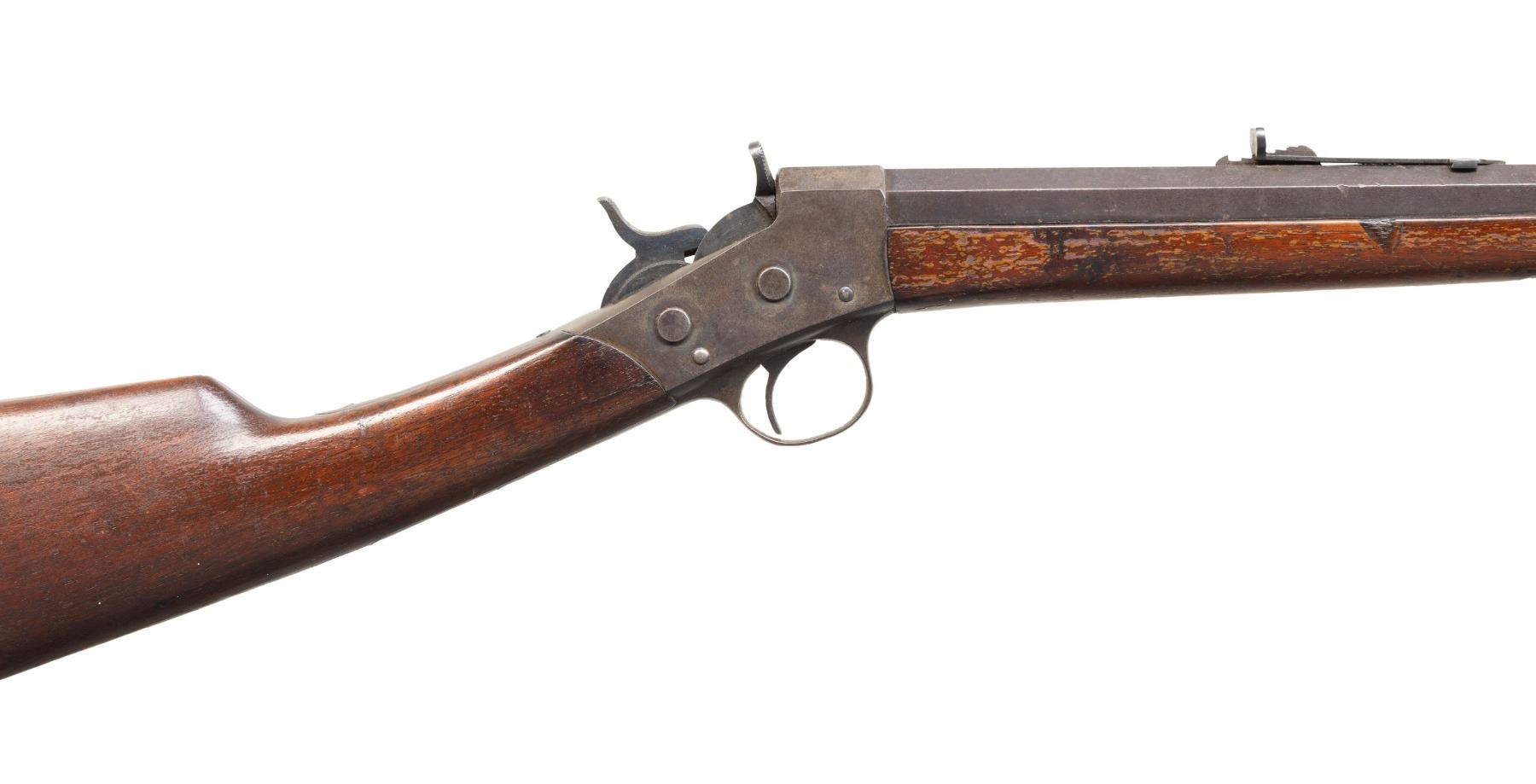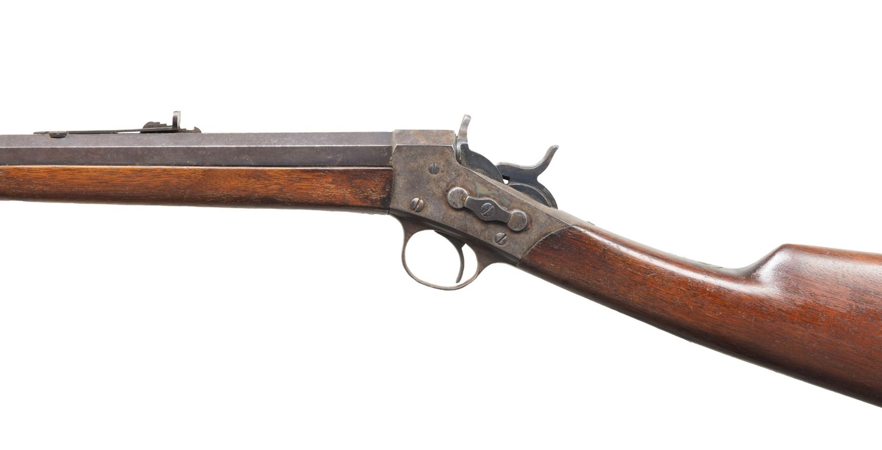 BLOCK RIFLE. CAL. 25-20. S# H44006. Oct. 28" bbl. w/ sporting sights. Rolling block action w/ patent dates on left side. Walnut stock set w/ black painted forearm tip & curved buttplate. CONDITION: barrel has brown patina with spots of corrosion all throughout. Action has faded case colors with brown patina & peppery oxidation throughout. Forearms has blistering finish with deep dings & marks. Buttstock has worn finish with sm. cracks at head of wrist along with large cracks around buttplate. Balance of rifling shows pitting; portion of bore in front of chamber shows significant cleaning of oxidation. PROVENANCE: Estate of Groves Herrick. (25-5679/MD). CURIO. $300-400.