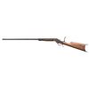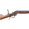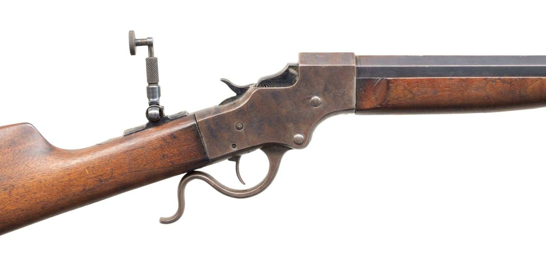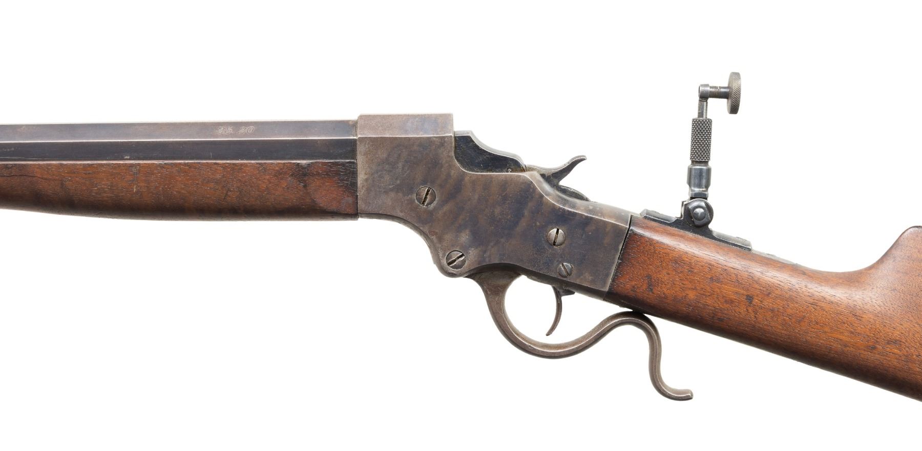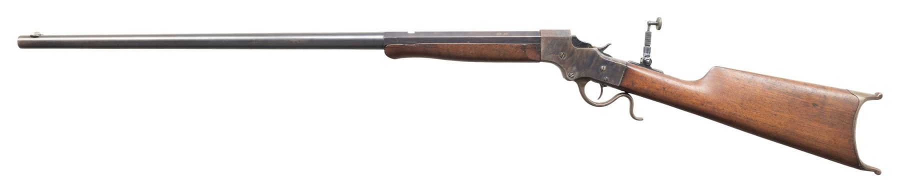 RIFLE. CAL. 25-20. S# 11166. Matching numbered half oct., half rnd. 28" bbl. Blade front sight, open rear dovetail & Marbles style peep tang sight. Walnut stock set w/ schnabel tip, & Scheutzen buttplate. CONDITION: receiver shows visible case colors mixing with brown patina (heavier on right side & carry areas) with peppery oxidation & scratches. Wood has worn finish with large cracks, numerous sm. dings & chip on left side forearm tip. Shallow rifling shows pitting forward of chamber. PROVENANCE: Estate of Groves Herrick. (25-5746/MD). CURIO. $500-800.