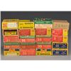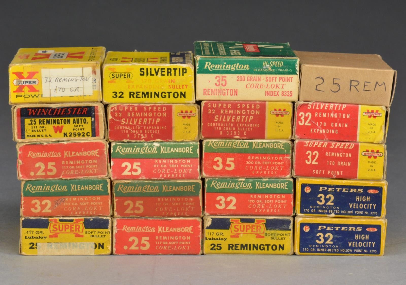 25 REM. (all 117 gr.): 4 3/4 Rem. red-green / 2 Super X blue-yellow box / 3/4 Win. blue-yellow / 1 mixed. 32 REM (all 170 gr): 2 Peters blue-yellow-red / 2 Rem. red-green / Super X blue-yellow silvertip / 4 Win. red-yellow silvertip / Win red-yellow SP / 1 mixed. 35 REM. (all 200 gr.): Rem. green-white / 1.5 Rem. red-green. CONDITION: good to very good. (02-14546-7/NW). $650-900.