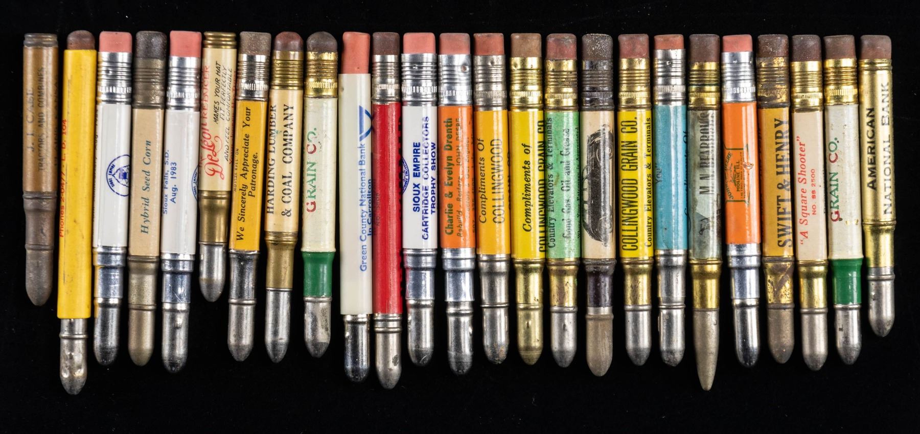 Measure approx. 4.5" overall with spitzer & bottlenose head bullets holding pencils in cases with advertisements & erasers. CONDITION: items are in good intact condition with some missing pencil. PROVENANCE: Norman Olliff Estate. (02-25657/MD). NON-GUN. $20-40.