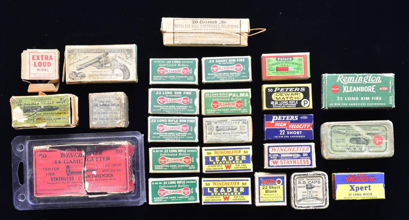 1 Winchester 22 Extra Loud blank cartridges in 1 piece box w/ red writing. / 1 Western 22 Short Blank 50 rd. 1 piece box w/ blue, yellow & red label. / 1 UMC BB Caps 2 piece box 58 of 100 rds. remain. / 1 Peters Hi Velocity 22 Short blue & red 1 piece box, partially full. / 1 Remington UMC Kleanbore 22 Short green,red, & white 1 piece box full. / 2 Remington UMC Kleanbore 22 Long. 2 Full red, green & white 1 piece boxes that differ slightly. / 3 Remington UMC Kleanbore 22 LR. 3 Full red, green & white boxes, 1 differs slightly. / 1 Remington UMC Kleanbore 22 LR Palma Match. Full red, green & white box. / 1 Peters 22 LR "N.R.A.". Sealed 1 piece box w/ red, green & yellow label. / 1 Peters 22 LR Dewar Match. 1 Full Black & gold 50 rd. 1 piece box. / 1 Winchester 22 LR. sealed 2 piece box w/ green label having red "W"' on end flaps. / 2 Winchester Leader Staynless 22 LR. Full red, blue & yellow 1 piece boxes. / 1 Winchester Staynless 22 LR. Full red, blue & white 1 piece box. / 1 Western Xpert 22 LR. Full red, blue & yellow 1 piece box. / 1 Remington UMC 32 S&W. Full 1 Piece 50 rd. box w/ green labels having red trademarks. / 1 Remington Kleanbore 32 Long RF. Green, red & white 1 piece box w/ mixed cartridges. / 1 American Metallic Cartridge Co. 32-100 S&W revolver. 2 Piece box containing 15 rds. 1 End flap is torn, rds. show corrosion. / 1 Frankford Arsenal 38 revolver ball cartridges. Sealed 20 rd. box. / 1 Winchester 44 Game Getter empty 2 piece box w/ torn red label. / 1 Winchester 22 Single Shot empty 2 piece box w/ torn lid missing 1 end flap. / 1 Peters Cartridge Co. 30 cal. full jacketed 220 gr. bullets for US Army rifles. Full 25 rd. 2 piece box w/ green label showing staining & tattering. CONDITION: boxes are good to very good unless noted. (02-13926/DS). $300-400.
