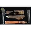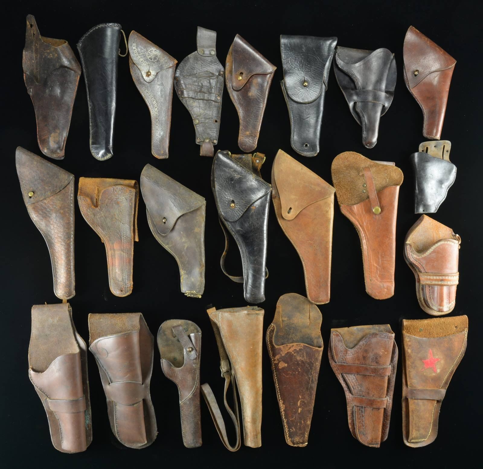 A wide variety of brown & black leather holsters, mostly unmarked. Notable examples include: Vietnam era Bolen US marked black leather 1911 holster. / 5" Bbl. holster marked "MADE IN CANADA". / Unmarked black leather holster for an 11" bbl. / Brown leather holster for 4" bbl. revolver marked "305B4 on belt loop. / Hunter 33104PA3 black leather holster.