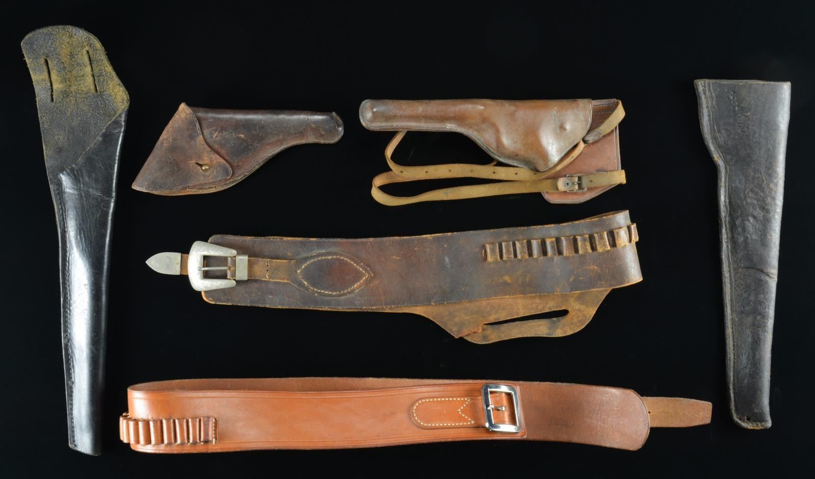 BELTS: 1 Texas Jack Fredericksburg Texas cartridge belt about a 32 waist, seems to fit 35 cal. cartridges. / 1 Hand made leather belt for about 30 waist having German silver buckle & tip. CONDITION: poor to good, items have wear, scuffs, loose stitching & oxidation. (02-16600/MD). $300-500.