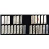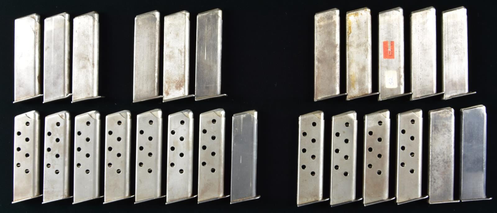 Factory magazines in good serviceable condition. 5 w/ rectangular bases retained by T shaped latch at rear plus 3 slots on side. / 3 w/ rectangular bases having latching dimple at front plus 3 slots on side; 2 are unmarked & 1 has "249971/1". / 3 w/ rectangular bases having side latch plus 3 slots on side; 1 unmarked & 2 Mauser marked. / 8 w/ rounded front Mauser marked bases having side latches plus 7 holes on each side; 1 is blued w/ holes on left side only. / 6 unmarked w/ rounded front bases having side latches; 4 w 7 holes on each side & 2 w/ 3 slots on one side (they may be for another model as bases are more square to bodies than the other 23 in the lot). (02-16951-18/NW). $800-1,200.