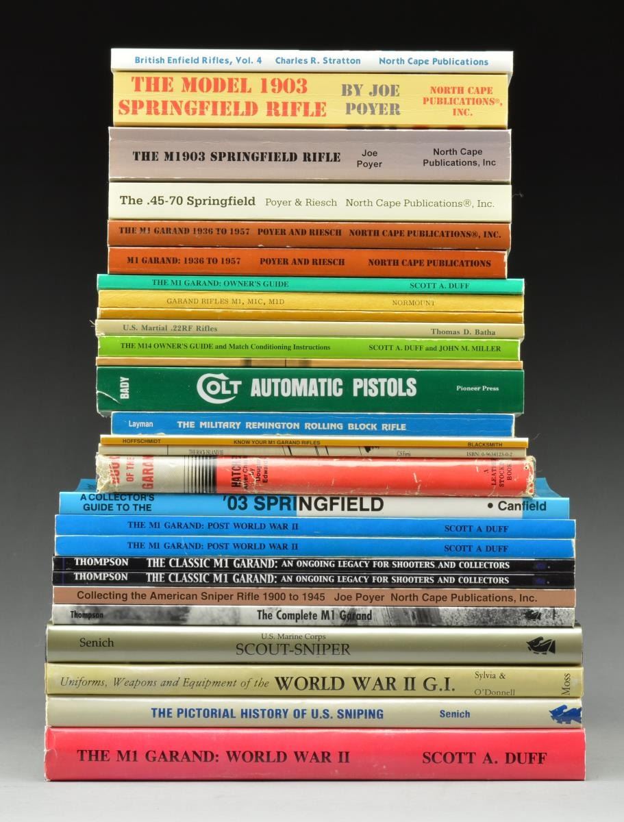 Notable examples include: GARAND RIFLES m1, m1C, M1D by Normount. / The .45-70 Springfield by Poyer & Riesch. / US Marine Corps Scout-Sniper by Senich. / The Pictoral History of U.S. Sniping by Senich. / US Martial .22RF Rifles by Thomas Batha. / The Complete M1 Garand by Thompson. / The M1 Garand: World War II by Scott Duff. / The M1 Garand: Post World War II by Scott Duff. / 03 Springfield by Canfield. / The MIlitary Remington Rolling Block Rifle by Layman. / The Model 1903 Springfield Rifle by Joe Poyer. / British Enfield Rifles Volume 4, the Pattern 1914 And US Model 1917 Rifles by Charles R Stratton. CONDITION: Good overall serviceable condition w/ wear. (02-16814-2/MD). $300-400.