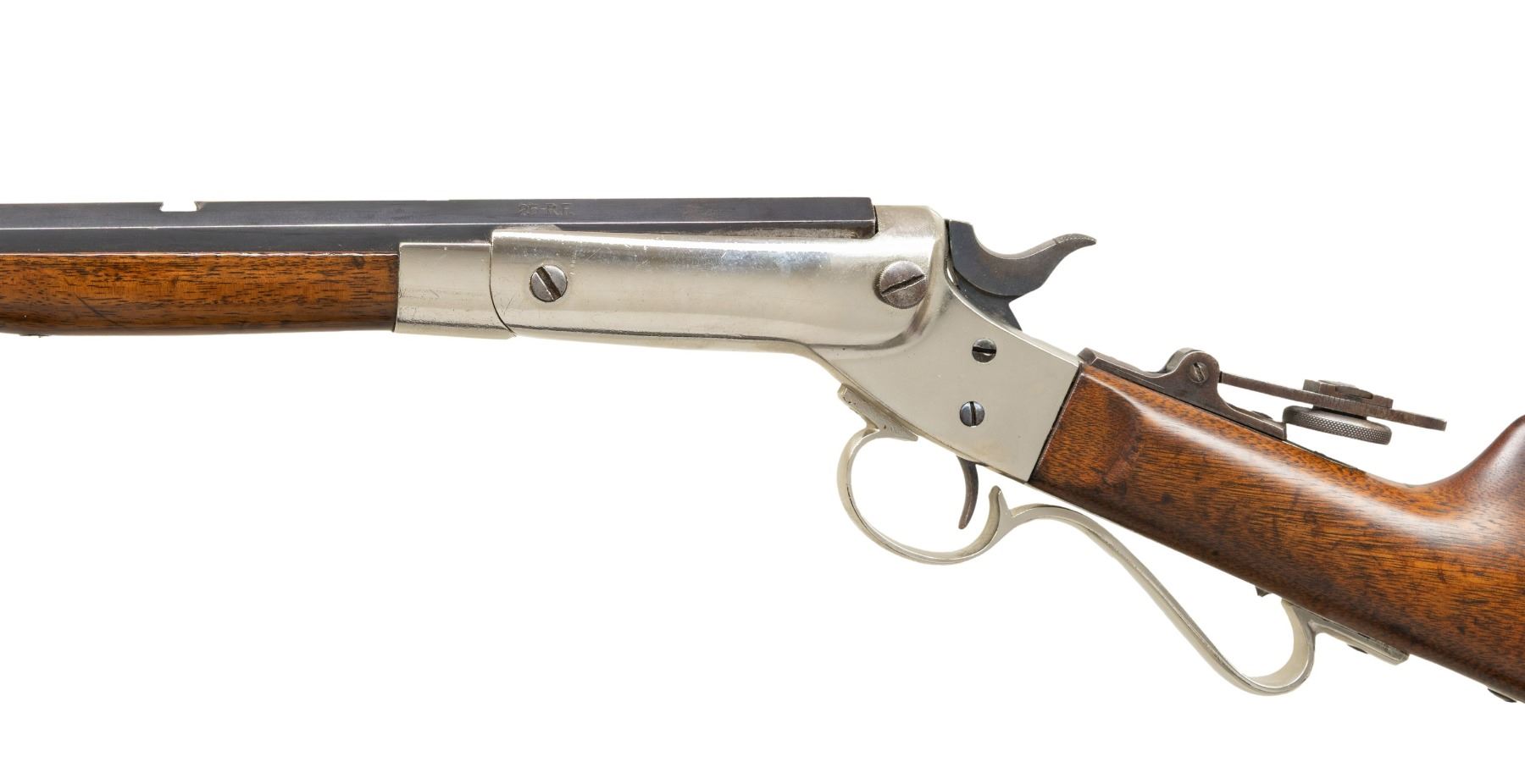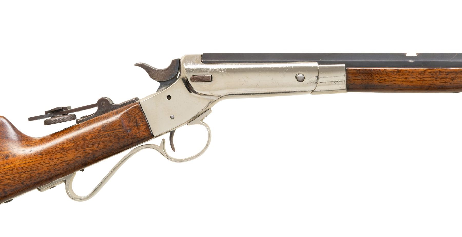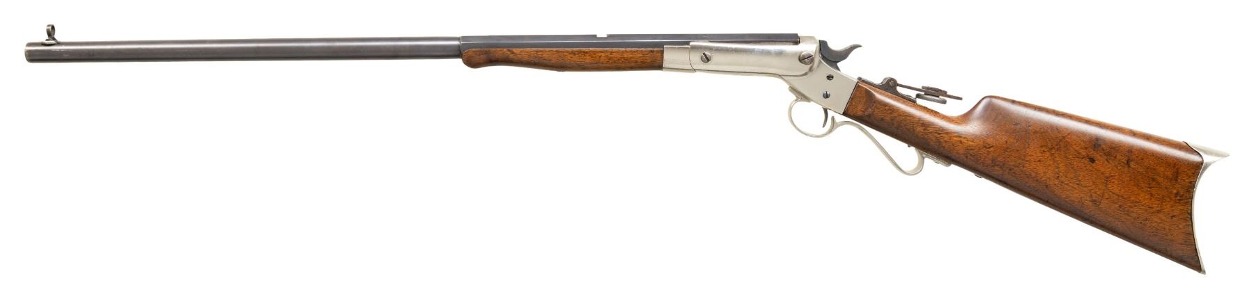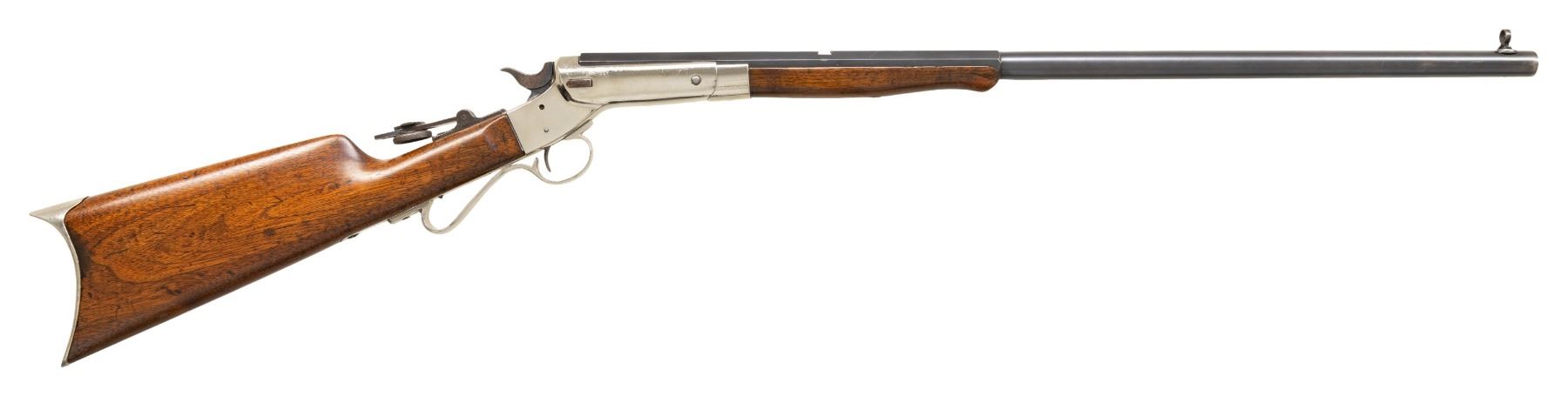 Cal. 25 RF (25 Stevens RF). S# 38867. Appears to be No. 7 Premier with matching numbered half. oct., half rnd. 24" bbl. Combination globe blade front sight, open rear dovetail & sliding peep sight. Nickel Tip up action w/ firing pin bushing & curled triggerguard. Walnut stock set w/ nickel finished crescent buttplate. CONDITION: good blue fading to brown patina with muzzle wear, marks & peppery oxidation. Refinished nickel showing prior pitting. Sanded & refinished wood shows sm. gaps at action, previous sm. dings & hairline cracks. PROVENANCE: Estate of Groves Herrick. (26-1008/MD). CURIO. $400-600.