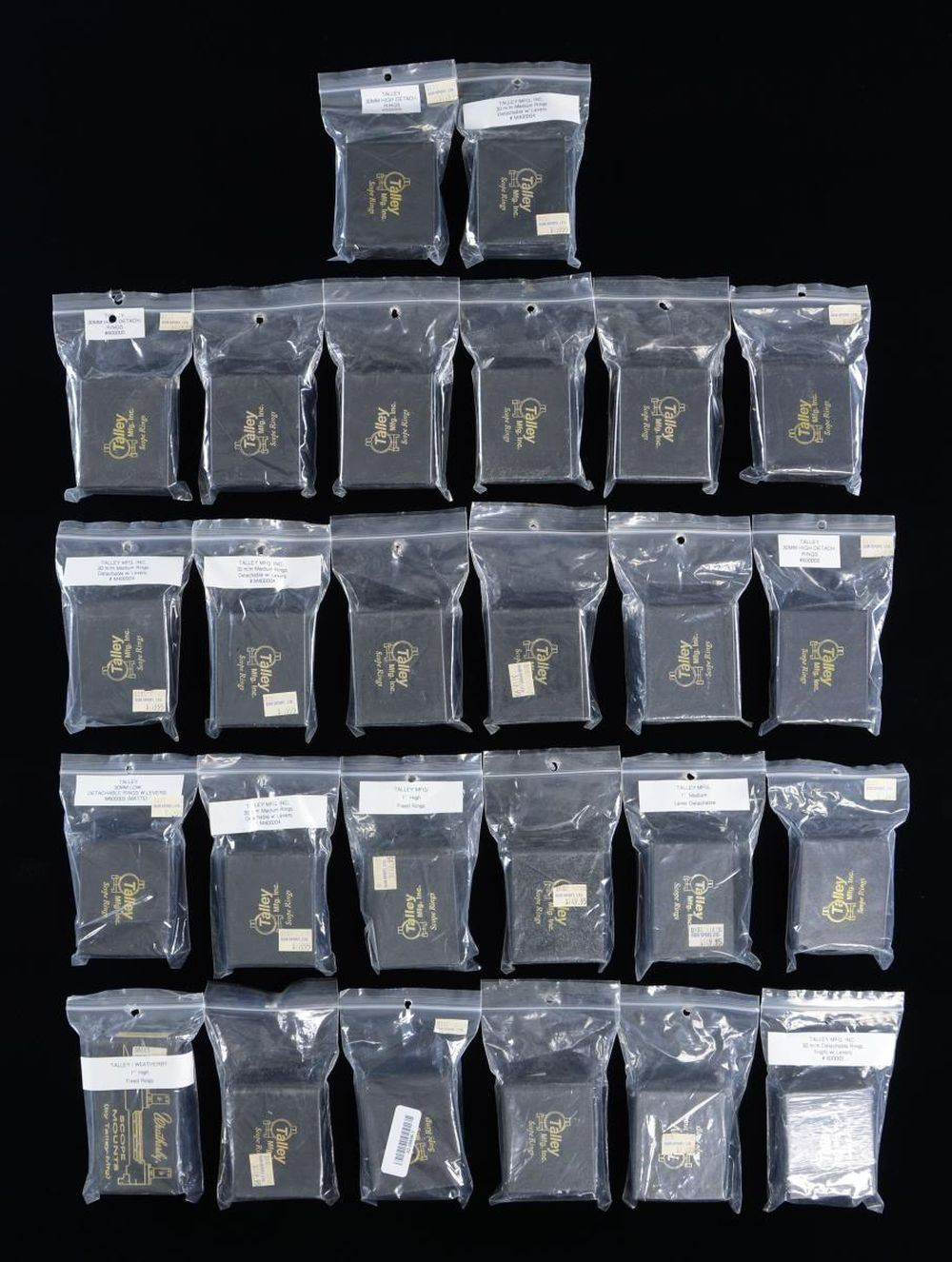 All appear new in Talley black 2 piece boxes. No specialty ring sets but various methods of attachment. All standard finish with some matte sets noted (M stock number prefix). FIXED: 3 Medium 1" #100004 and 1 High 1" #100005. LEVERS: 3 Low 30mm #600003, 1 Low 30mm #M600003, 4 High 30mm #600005, 1 Medium 1" #500004. SCREW LOCK: 4 Medium 1" #M200004, 4 High 1" #M200005. DETACHABLE: 4 Medium 30mm #M400004. WEATHERBY (by Talley): 1 TRFSGH1 with "W" engraved on side of 1" vertical split Premier style ring appearing high. PROVENANCE: The Collection of Gun Sport Ltd owned by Jon R. Thomas. (02-20856-1/NW). $1,400-2,000.