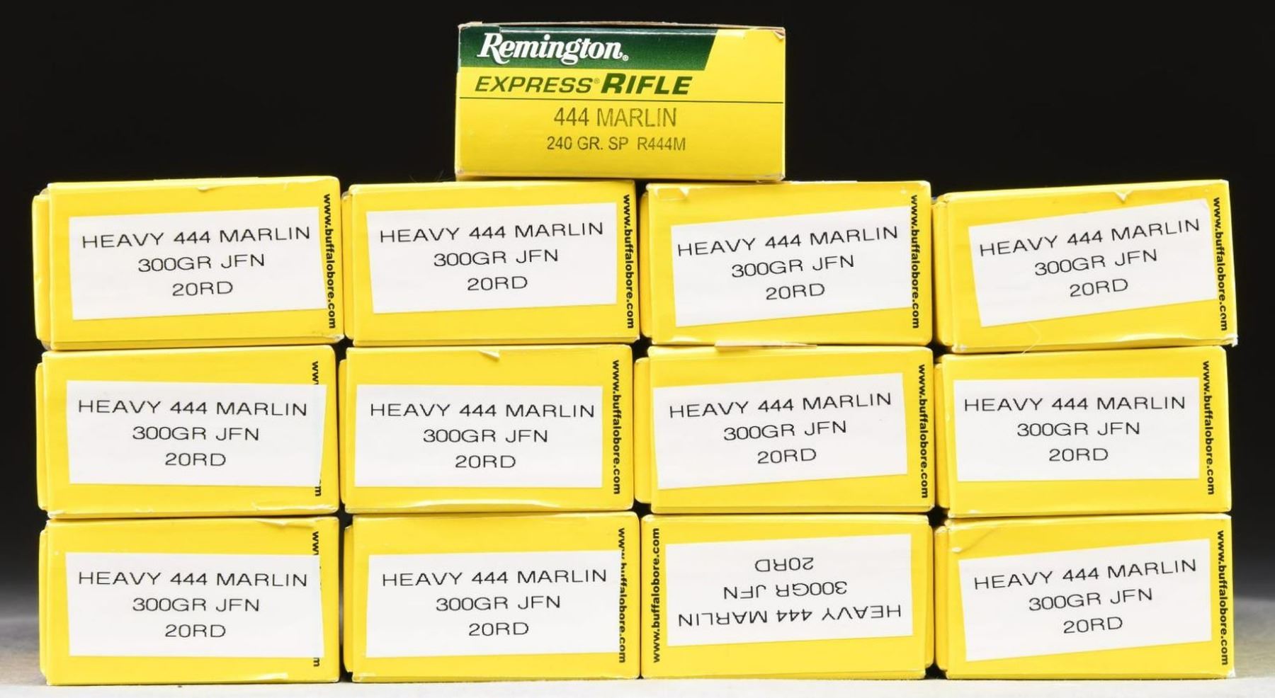 240 RDS. (12 BOXES) Buffalo Bore Heavy 300 gr. JFN. 20 RDS. (1 BOX) Rem. 240 gr. SP. CONDITION: Buffalo Bore boxes sealed. Rem. box very good; ammo appears serviceable. PROVENANCE: The Collection of Gun Sport Ltd owned by Jon R. Thomas. (02-20276/MD). $600-1200.