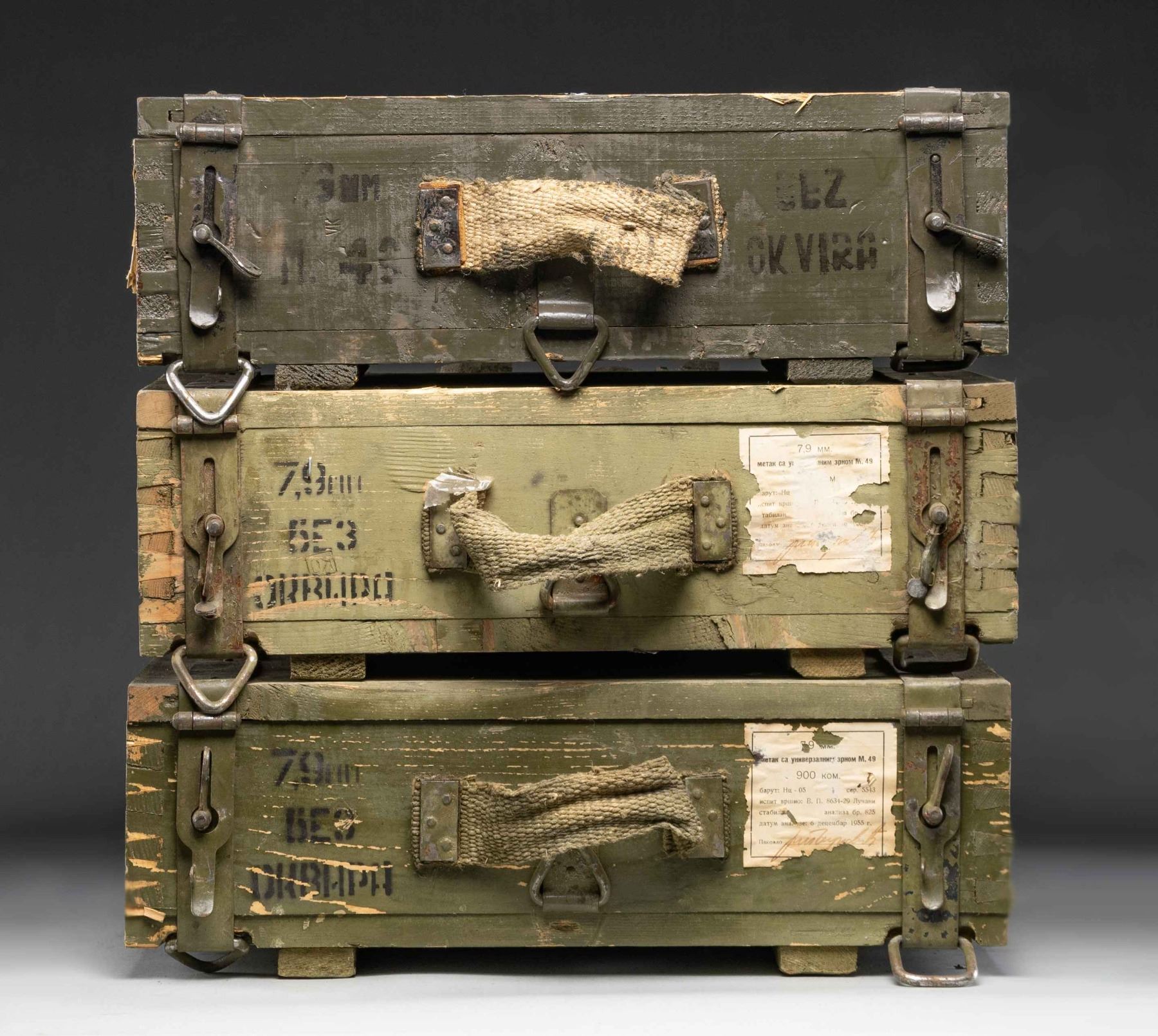 Three 900 rd. cases of Yugo 8mm Mauser ammo. Crates have 1950's dates & ammo is no doubt corrosive. CONDITION: ammo is in crates. Crates show varying degrees of age related wear. (02-25027-16/MJC). $800-1,200 for lot.