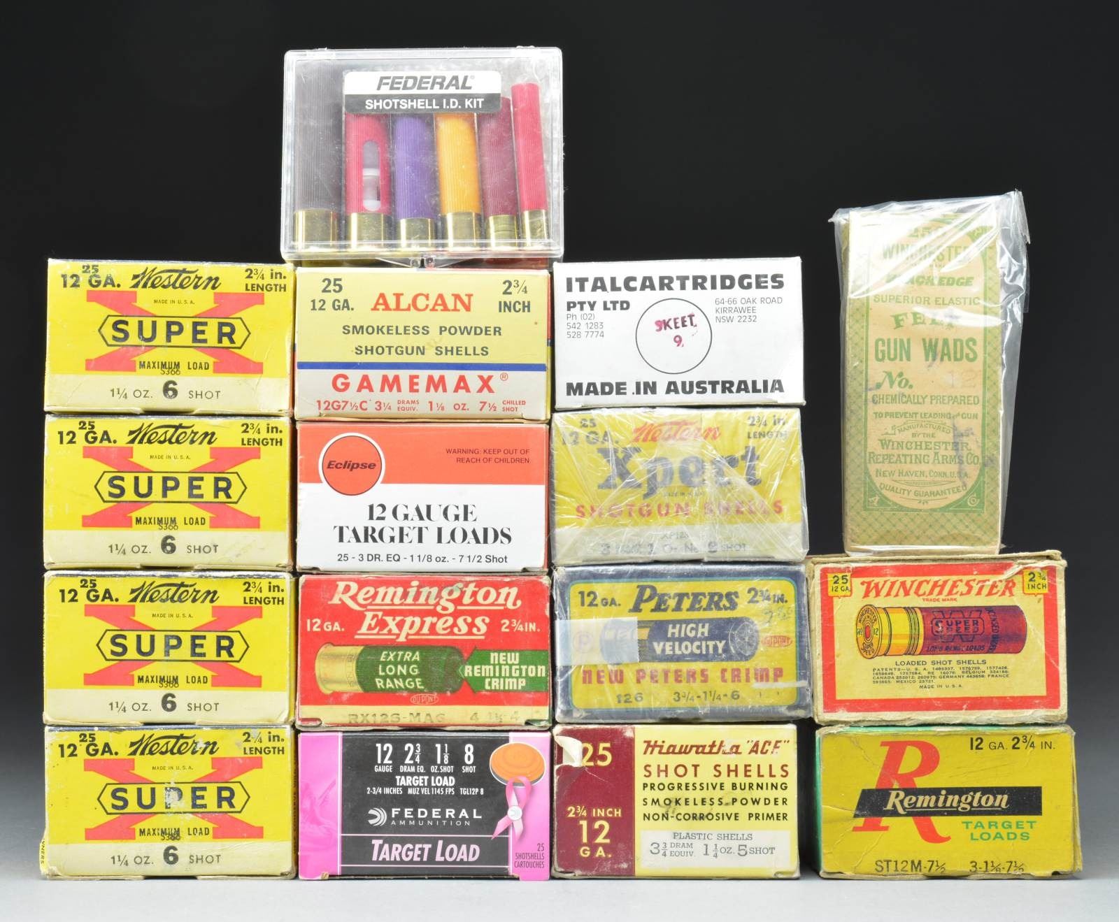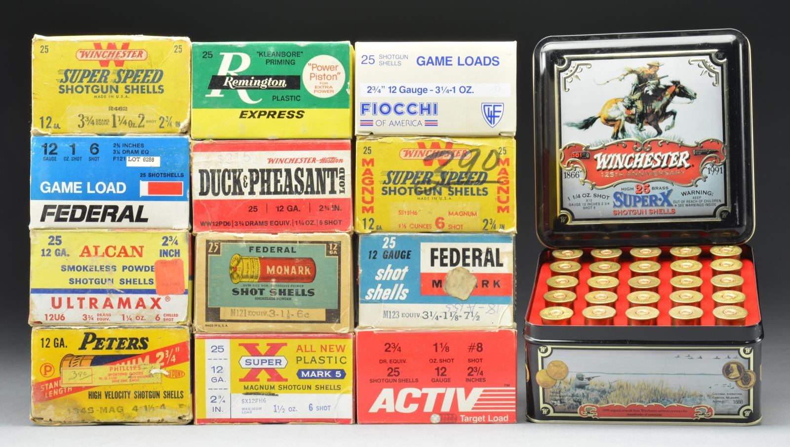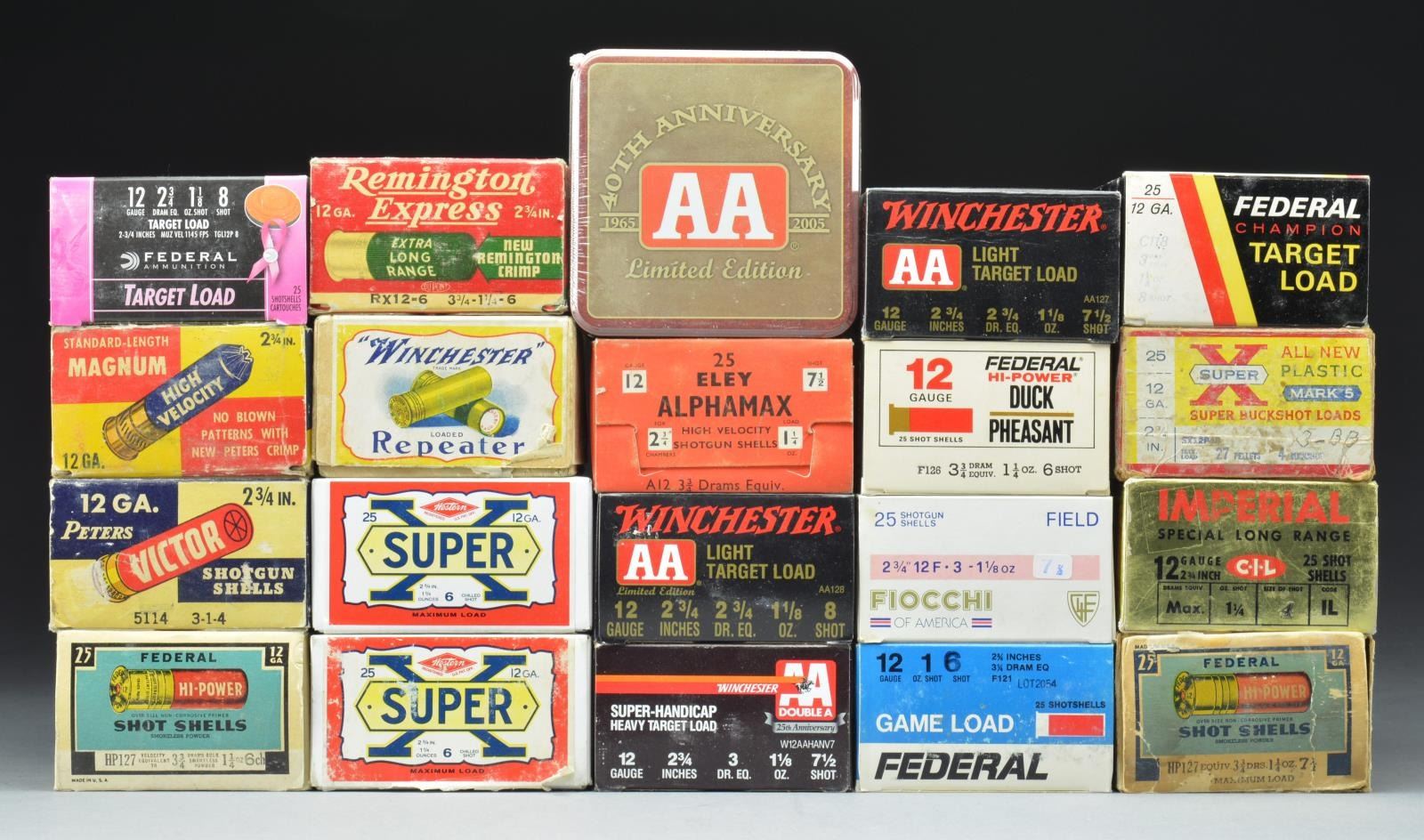 27 FULL BOXES (675 RDS.) OF 12 GA., 2 3/4: 26 boxes of various different makers & loads; primarily No.6 to 8 shot. Notable example is a sealed Winchester 40th Anniversary Limited Edition AA Light Target Load #8, 1 Winchester 125th Anniversary tin w/ 25 rds. of # 6.