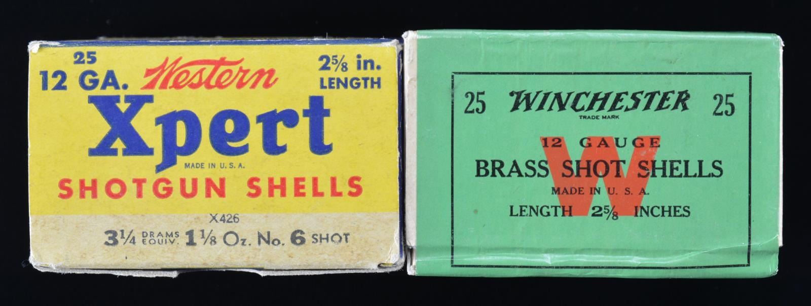 2 FULL BOXES OF 12 GA. 2 5/8": 1 Peters #6 ammo & 1 Winchester brass shot shells.