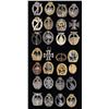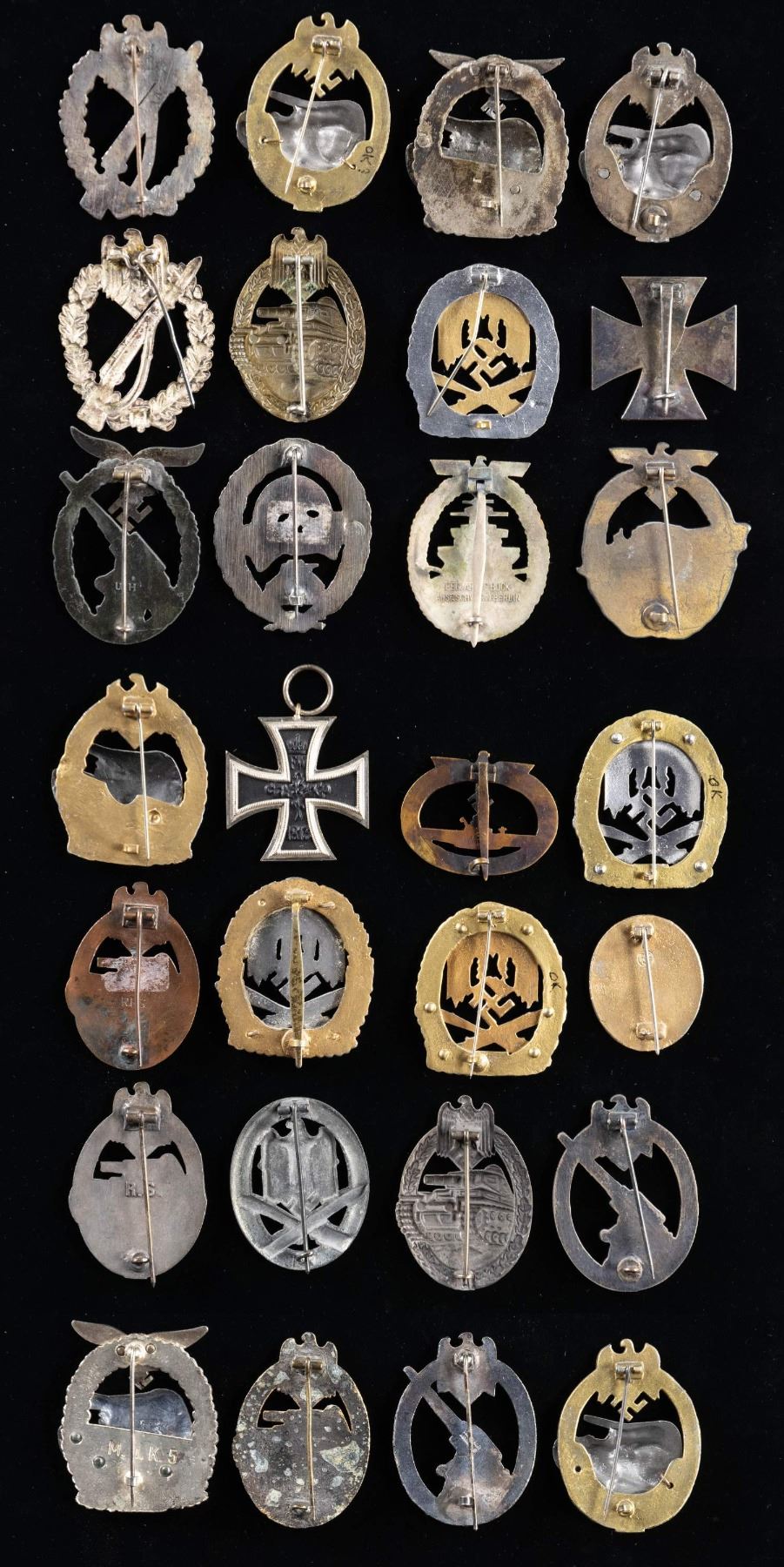 An interesting collection of 28 WWII German badges and medals of various types and styles. We feel that all of these awards are of post WWII manufacture and should be considered reproductions. It is possible an authentic example or two may have slipped through, so please look closely and form your own opinion. CONDITION: nearly all badges show very light wear. (02-25334/BF). NON-GUN. $300-500.