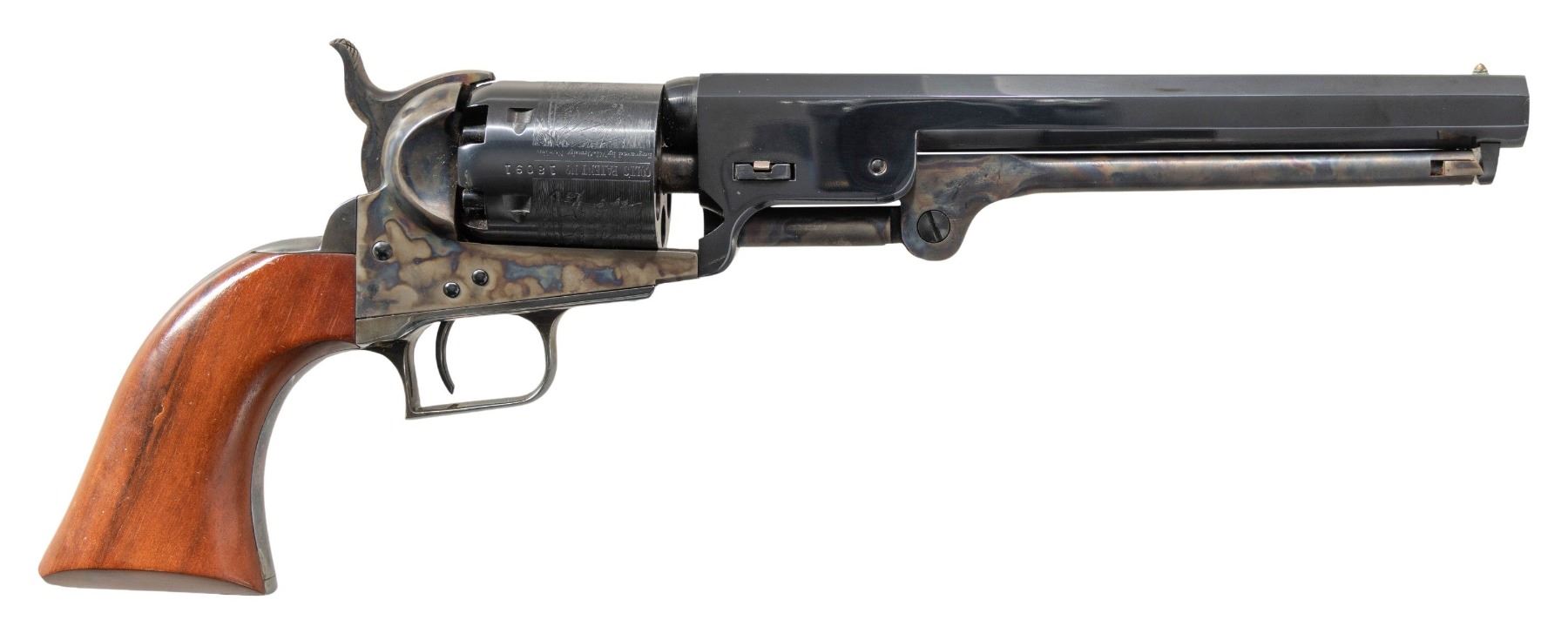 REVOLVER. Cal. 36. S# 18091. Standard configuration 7.5" octagonal barrel, rolled Texas Navy battle scene on cylinder. Blued barrel & cylinder. Case colored frame, Loading assembly, and hammer. Manufactured 1971. CONDITION: like new, revolver retains virtually all of its original bright case and blue color. (01-28163/JS). ANTIQUE. $800-1,200.
