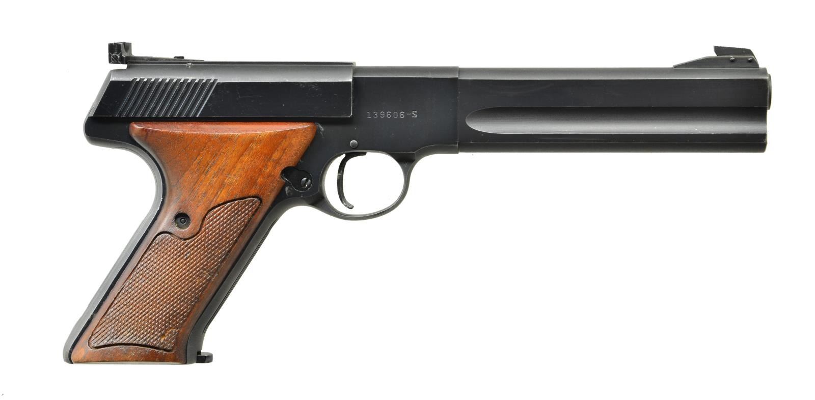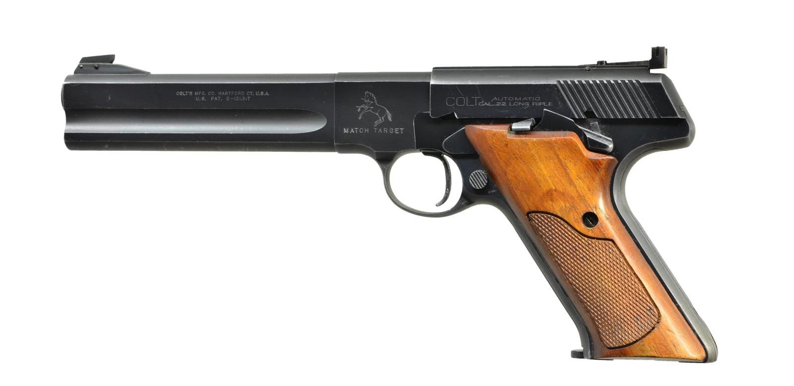 22 LR PISTOL. Cal. 22 LR. S# 139606-S. Bbl. 6". Colt's second series of the popular Woodsman line was manufactured from 1947-1955. This particular model designated & marked "Match Target" was manufactured in 1954. It utilizes the traditional rectangular bbl. design w/ lg. 4.5" flute on both sides. The finish is a combination of dark gloss blued on sides while matte finished top & bottom. Blade style target front sight. Serrated slide w/ adjustable target rear sight. Left side controls. Thumb actuated serrated mag. release. Checkered hardwood grips. Rear mounted lanyard loop. Serrated front & rear of pistol grip. Mag: 2 steel 10 rd. mags. UNATTACHED ACCESSORIES: plastic carry case. CONDITION: Original blued finish complete & consistent w/ signs of use in the form of occasional lines, thinning on high spots & in areas of mechanical intervention. Bright bore w/ strong rifling. Fire control mechanism appears to function correctly when cycled by hand. (22-1808/JZ) CURIO. $600-900.