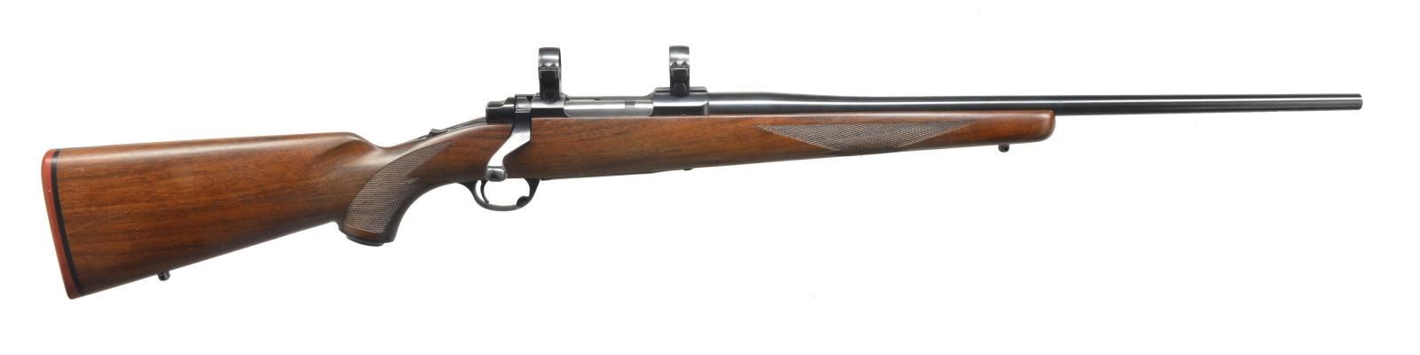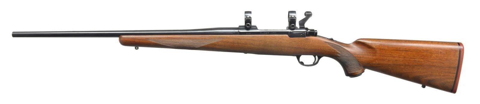 RIFLE. Cal. 243 Win. S# 2849. Bbl. 22” rnd. made w/ out sights. Receiver cut for Ruger rings, installed. Stock is checkered. Checkered pistol grip w/ black grip cap & Ruger emblem. Rounded Ruger recoil pad. Shaft of bolt handle has etched matching number. CONDITION: bbl. has original finish w/ a few minor marks near muzzle & minor muzzle wear. Receiver has original blue w/ minor sharp edge wear. Floorplate & trigger guard have original finish w/ some light scratching on floorplate. Stock has original finish w/ hand wear in grip area & each side of floorplate. Stock has minor grain crack behind trigger guard tang. Bore is good. (20-4158/BT). MODERN. $700-1,000.