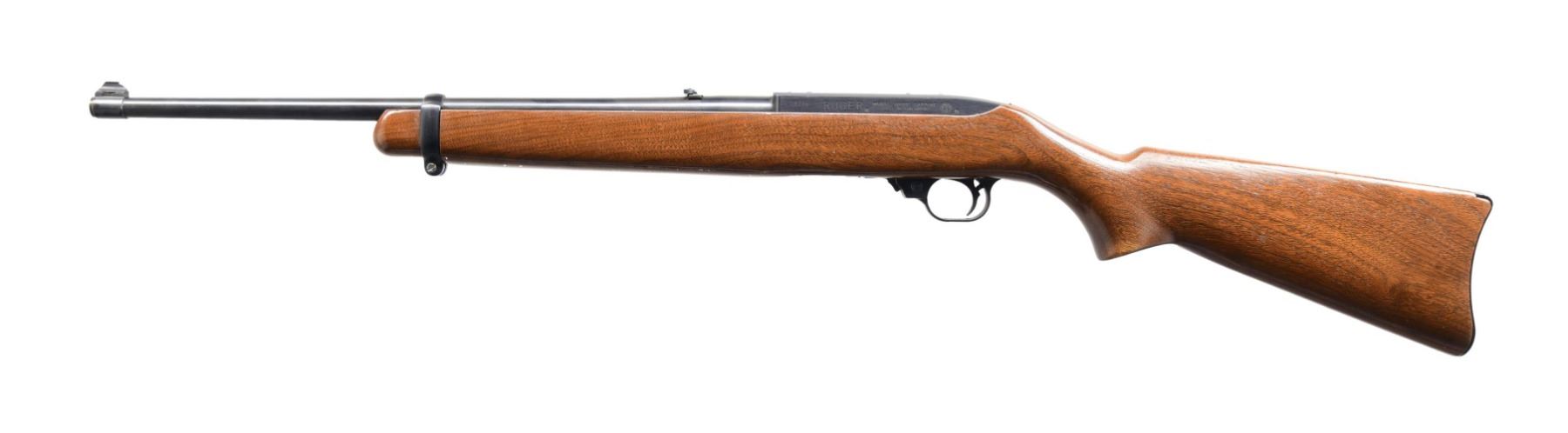 Cal. 22 LR. S# 28206. Bbl. 18 1/2" with banded brass bead front sight and dovetailed folding leaf rear. Mfg. 1965 (1964 to date) as 10/22R having walnut stock with early rear slanting cut forend plus anodized aluminum carbine buttplate; current production has stained hardwood stocks with Celcon plastic buttplates plus "warning marks" starting in 1978. MAGS: 1 factory 10 rd. CONDITION: very good plus overall with near excellent bore. Light handling marks throughout stock set; near excellent buttplate. Very minimal peppery oxidation on barrel and some high edge wear about trigger guard. Faint witness marks on top of receiver from prior scope base installation; plug screws presently installed. (23-6571/NW). CURIO. $300-400.