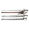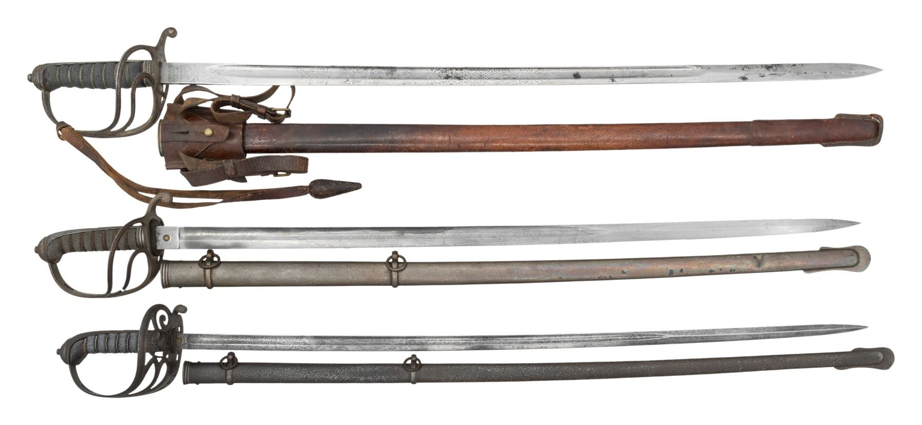 1) British M1855 Royal Artillery sword measuring 38 3/4" overall with an etched blade that shows foliate motifs, flaming bomb, "9th" (with monogram), and a field cannon. The blade's ricasso is marked "HOBSON & SON ST. MARTINS LANE LONDON". Iron 2 branch hilt with a wire wrapped shark skin grip and an iron scabbard. CONDITION: blade has a light gray patina with some very minor spotting. Hilt shows a dark gray patina. Grip is undamaged. Scabbard has a light gray patina with 1 notable dent. 2) British M1855 Royal Artillery sword measuring 39 3/4" overall with an etched blade that shows foliate motifs, British royal crest, "ROYAL ARTILLERY", and GRv. The blade's ricasso is marked "GUTHRIE & VALENTINE CORK ST. LONDON. W.". Iron 2 branch hilt with a wire wrapped shark skin grip and an russet leather scabbard and carrying straps. CONDITION: blade has a light gray patina with some oxidized spotting. Hilt shows a dark gray patina. Grip is minor losses at the pommel. Scabbard is a bit scuffed and the tip is partially detached. 3) British M1845 Royal Scots Grenadiers sword measuring 39" overall with an etched blade that shows foliate motifs, a crowned flaming bomb, and numerous battle honors. The blade's ricasso is marked "CARTER & CO. PALL MALL LONDON". Iron semi-basket hilt showing a pierced guard featuring a flaming bomb. Wire wrapped shark skin grip and an iron scabbard. CONDITION: blade has a dark somewhat stained patina with a mottled appearance. Hilt shows a dark gray patina. Grip has very minor losses. Scabbard has an oxidized ant pitted finish. PROVENANCE: From the PMRB Collection. (02-25858/BF). NON-GUN. $500-800.