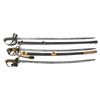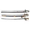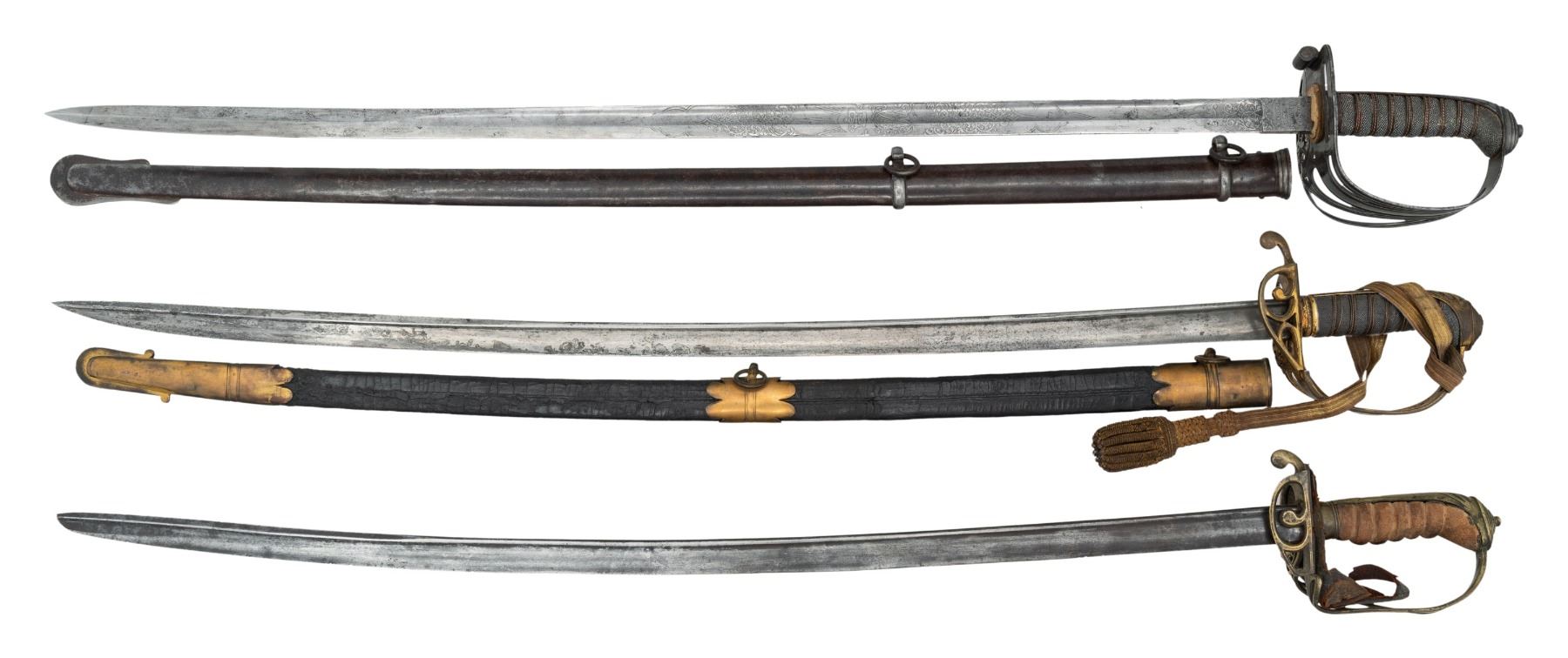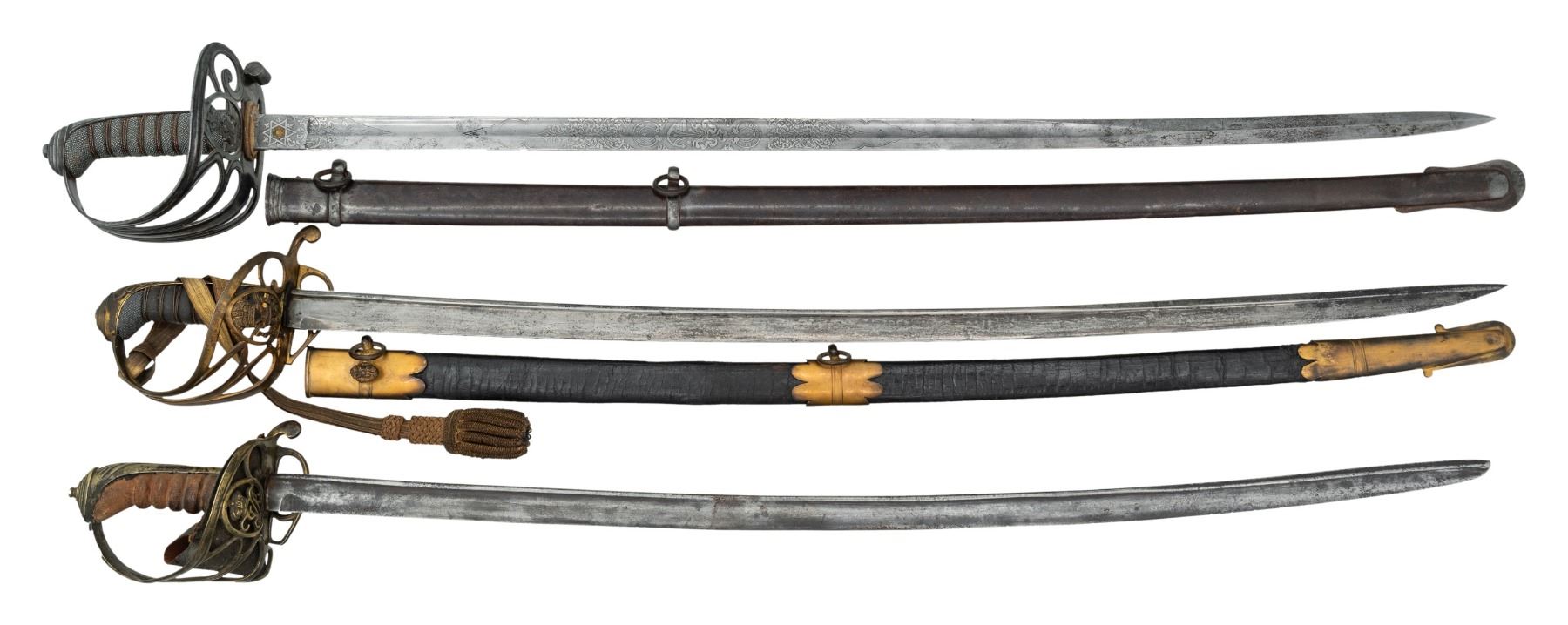 1) British M1822 Infantry officer's sword measuring 37 3/4" overall with an etched blade. The etched pipe back blade shows several foliate motifs along with British patriotic and military motifs. Due to wear, no makers mark is apparent on the blade. Gilded brass semi-basket guard with a George IV cipher in the center. Wire wrapped sharkskin grip with a gilded sword knot attached. Gilded brass mounted leather scabbard. CONDITION: blade is quite worn and shows some evidence of sharpening / buffing. Hilt is quite solid with better than 50% of the original gilding remaining. Grip shows light wear but some of the wire is dislodged. Knot is solid. Scabbard is complete but a bit floppy. Mounts retain about 40% of original gilding. 2) British M1822 Infantry officer's sword measuring 37 3/4" overall with a pipe back blade. Due to wear, no makers mark is apparent on the blade. Gilded brass semi-basket guard with a Victoria cipher in the center. Originally a wire wrapped sharkskin grip with only the wood core remaining. No scabbard. CONDITION: blade is exceptionally worn and shows some evidence of sharpening / buffing. Hilt is misshaped with no gilding remaining. Grip consists of a wood core only. 3) British M1855 Rifle Volunteer sword measuring 39 3/4" overall with an etched blade that shows foliate motifs, a crowned " VR ", rifleman horn, and " VOLUNTEER RIFLES ". The blade's ricasso is marked " R. S. CARDEN 200 PICCADILLY LONDON. Iron semi-basket hilt showing a pierced guard featuring a crowned rifleman's horn. Wire wrapped shark skin grip and an iron scabbard. CONDITION: blade has a light patina with scattered stains. Hilt shows a gray patina with light wear. Grip shows light wear. Scabbard has a pleasing patina with no notable dents. PROVENANCE: From the PMRB Collection. (02-25861/BF). NON-GUN. $500-800.