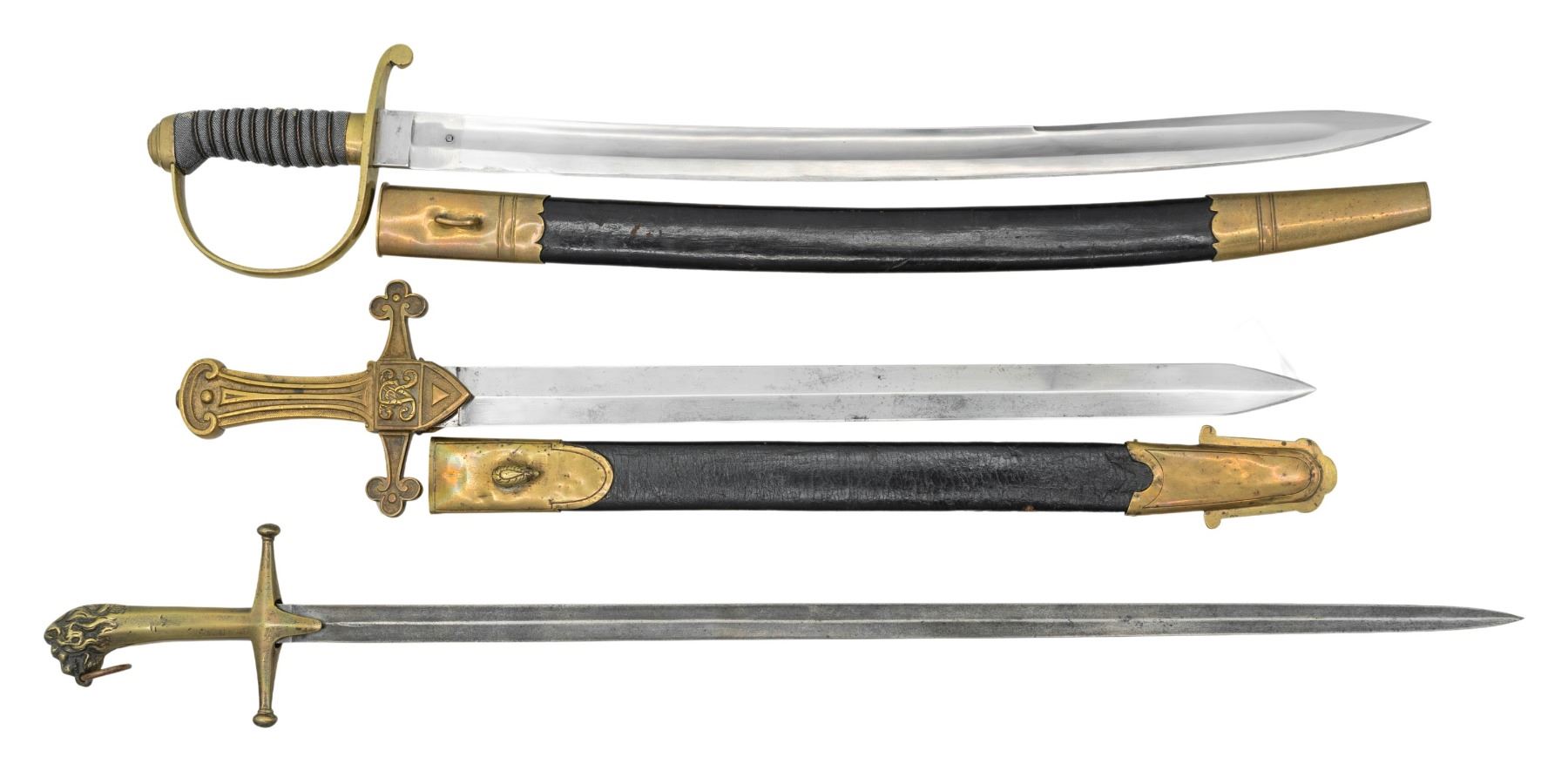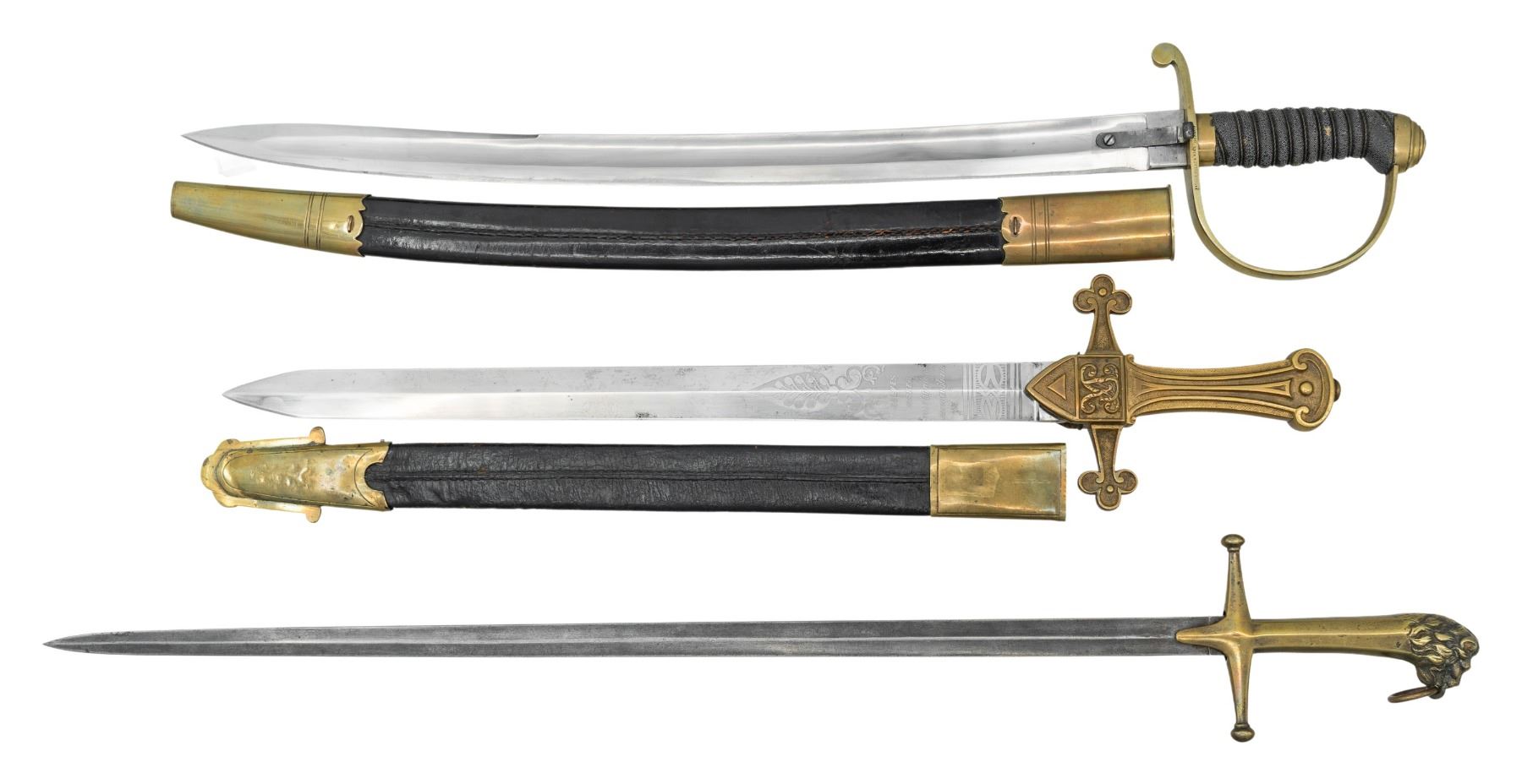 1) British pattern 1850 Constabulary sword measuring 27 1/2" overall with a plain unmarked blade with a spring catch. Simple brass hilt marked on the side "PARKER FIELD & SONS LONDON" with a wire wrapped shark skin grip. Brass mounted black leather scabbard. CONDITION: light wear overall with very minor losses to the grip. 2) Circa 1820 British bandsman's sword measuring 31 1/2" overall with a plain unmarked blade that is diamond in cross section. Solid brass hilt and grip with a lion's head pommel featuring a lanyard ring in the lion's mouth. No scabbard. CONDITION: blade has a dark patina and the hilt shows light wear. 3) British pattern 1856 drummer's sword measuring 25" overall with a small amount of etching on one side. The blade is marked "REEVES MAKER TOLEDO WORKS Birmingham". Solid brass hilt and grip with a "VR" in the center of the crossguard. Brass mounted leather scabbard. CONDITION: sword shows very light overall wear and the scabbard shows heavier use. PROVENANCE: From the PMRB Collection. (02-25863/BF). NON-GUN. $500-800.
