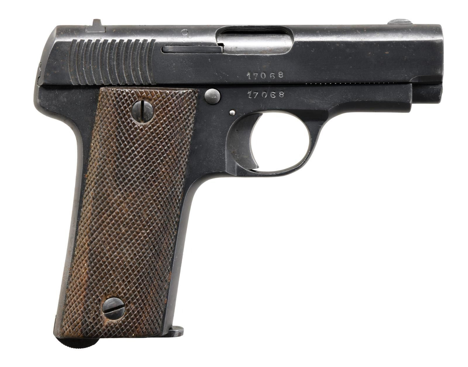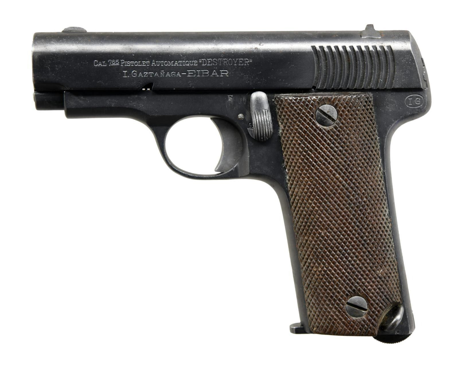 1) I. GAZTANAGA DESTROYER SEMI AUTO PISTOL. Cal. 32 ACP. S# 17068. Bbl. 3 3/8". Matching numbers on slide & frame. Round blade front sight. Fixed V-notch rear sight. "Ruby" style pistol but no French star markings or added rivet. Rear of frame marked w/ a circled "IG". Lanyard ring present on left side of grip frame. Checkered hardwood grips. MAGS: 1-8 rd. unmarked blued that appears to be of recent mfg. CONDITION: grips show some chipping around screw holes, chipped points, dings & handling wear. Metal retains 80% of an arsenal grade reblue w/ scattered edge wear, oxidation spots & blued over pitting. Fair bore w/ some light pitting & frosting. (23-4687/MJC). CURIO. 2) HY HUNTER FRONTIER SIX SHOOTER SA REVOLVER. Cal. 22 LR. S# 01972. Bbl. 5 1/2". Blade front sight. Fixed rear sight. Blued & anodized finishes. West German made large frame Western style revolver. Faux carved bone grips. CONDITION: grips show some staining & handling wear. Metal shows overall fading to gray, edge wear & a drag line on cyl. Bore shows scattered frosting but strong rifling. (23-4697/MJC). MODERN. 3) ALFA SPANISH DA REVOLVER. Cal. 32-20. S# 52114. Bbl. 5". Round blade front sight. fixed rear sight. Spanish Alfa made revolver. Cyl. & underside of bbl. numbered "323" likely an assembly number. Blue finish. Checkered hardwood grips. CONDITION: grips show some gouges, wear to checkering, dings & handling marks. Metal retains 30% blue w/ overall flaking to brown & scattered oxidation. Bore shows some pitting but evident rifling. (23-4704/MJC). CURIO. $450-750.