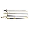 1) BRITISH. Overall length: 38 1/4". Blade length: 31 3/8”. A 19th century British Naval officer’s sword with a blade that’s etched over the first 13 1/2" with various military and patriotic devices. The ricasso is etched “J. FRIEDEBERG QUEEN ST PORTSEA”. Portsea is an island area near Portsmouth, England. Gilded brass hilt with a folding inner guard and a crowned anchor decorating the outer guard. Lion head pommel with wire-wrapped white sharkskin grip. A partial sword knot is attached to the hilt. Gilded brass-mounted leather scabbard. CONDITION: blade has a light gray, mottled patina. Hilt shows only traces of original gilding but is undamaged. Grip is 100%, but the wire is a bit dislodged. Scabbard mounts show only traces of original gilding, and the leather body shows scuffs and scrapes but no breaks. 2) FRENCH. Overall length: 38 1/2". Blade length: 32”. A model 1884 French NCO sword with a plain triangular blade etched near the ricasso “M=d’Armes de Chalt 7 bre= 1888 Epee de S.G Mle=1887”. Brass hilt with a flaming bomb on the front guard and the number “6737” stamped on the back guard. The plain knuckle bow has three hallmarks, and the grip is simulated wire-wrapped. Darkened iron scabbard. CONDITION: blade has a light gray overall patina. Hilt shows light overall wear. Scabbard remains solid, with oxidation primarily around the drag. 3) SPANISH. Overall length: 37 1/2". Blade length: 30 3/8”. Blade has a single narrow fuller and is stamped on the ricasso, “TOLEDO SPAIN”. Plated guard with a black and red enameled Spanish crowned royal crest. Two-piece composite grip with a plated pommel. Plated iron scabbard. CONDITION: blade has been heavily sharpened. Hilt, except for the guard, has lost much of its plating. Scabbard remains solid with light wear. (02-22800-3/BF). $600-900.