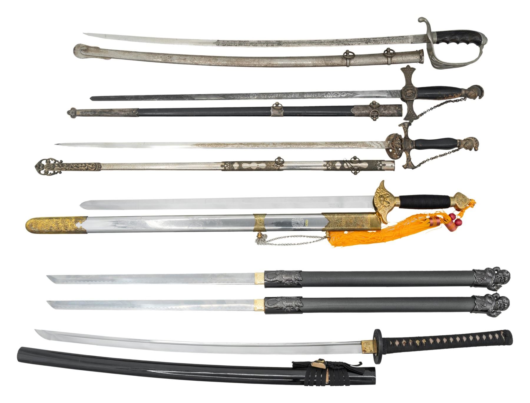 3 FANTASY, 2 FRATERNAL, & US M1902 SWORDS.