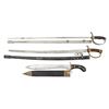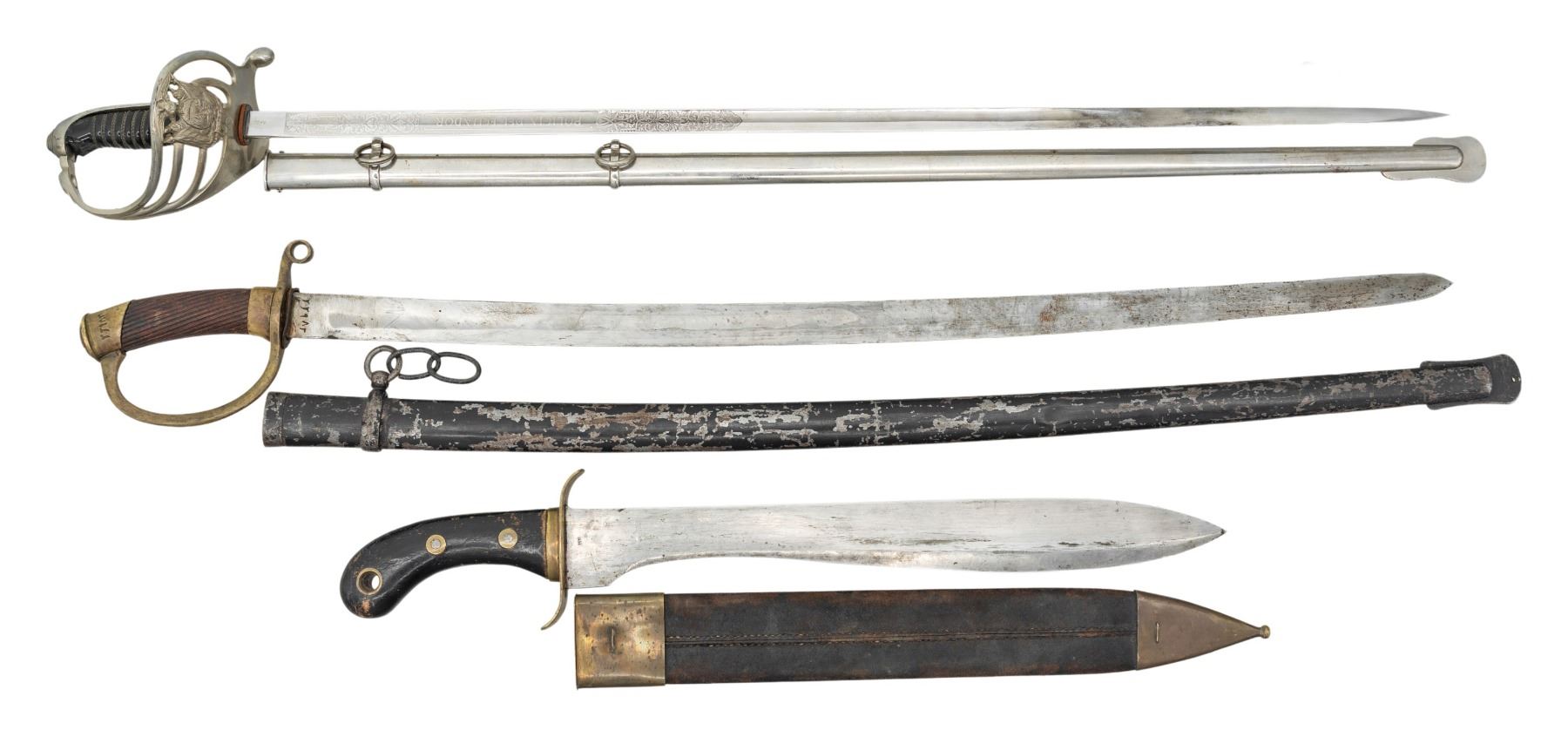 1) Swedish M1848 short sword or fascine knife measuring 24 1/4" overall with a plain blade stamped "AH" likely for Holler of Solingen. Brass S shaped guard and 2 piece wooden grips with a lanyard hole at the pommel. Brass mounted leather scabbard. CONDITION: blade has a pleasing gray patina. Hilt and scabbard show light wear with scuffing. 2) Ecuadorian Police dress sword measuring 38 1/2" overall with an etched blade marked "(logo) WKC" & "GERMANY KIFFE". The blade is etched with the arms of Ecuador, foliate motifs, and a panel that reads "POLICIA DEL ECUADOR". Plated hilt with a 3 branch guard featuring the arms of Ecuador. Wire wrapped composite grip and a plated scabbard. CONDITION: light wear overall. 3) Likely an early Iranian copy of a Russian M1881 shashka measuring 39 1/4" overall with a plain blade marked with Persian numbers at the ricasso. Brass hilt with Persian numbers on the pommel and a reeded wood grip. Steel scabbard with a black painted finish. CONDITION: a well used saber with wear throughout and 60% finish on the scabbard. (02-26135/BF). NON-GUN. $500-700.