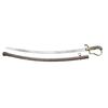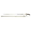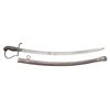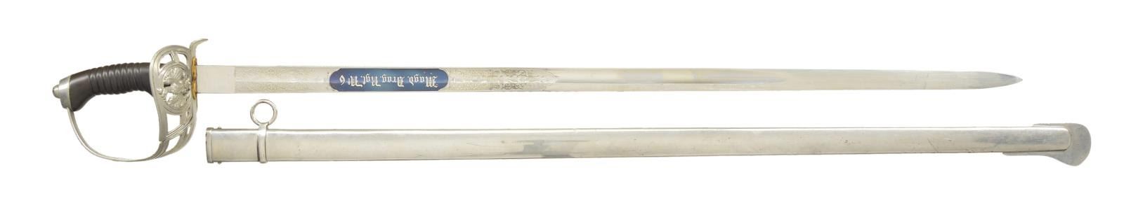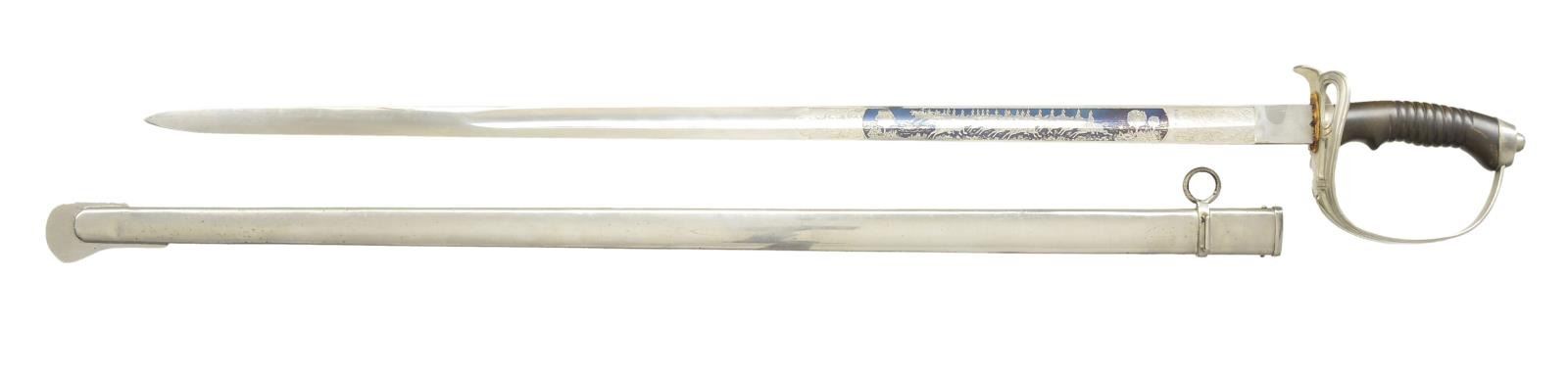 1) DRAGOON: Overall length: 39 5/8”. Blade length: 32”. A single fuller blade etched over 1/3 of its length with foliate motifs and 2 large blued panels. The 1/8” panel on one side depicts a unit of dragoons at the charge. The other 4 1/2" panel reads “Magd. Drag. Rgt. No 6”. Steel hilt with a folding semi basket guard featuring a Germanic eagle. Plain pommel. Spirally ribbed composite grip. Plated iron scabbard. CONDITION: blade shows original factory polish and engraved panels remain exceptionally sharp. Hilt and grip show light wear. Scabbard shows very minor spots of oxidation.