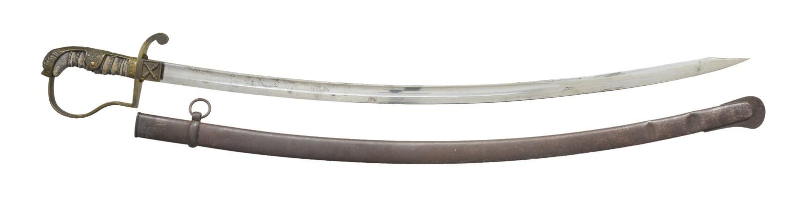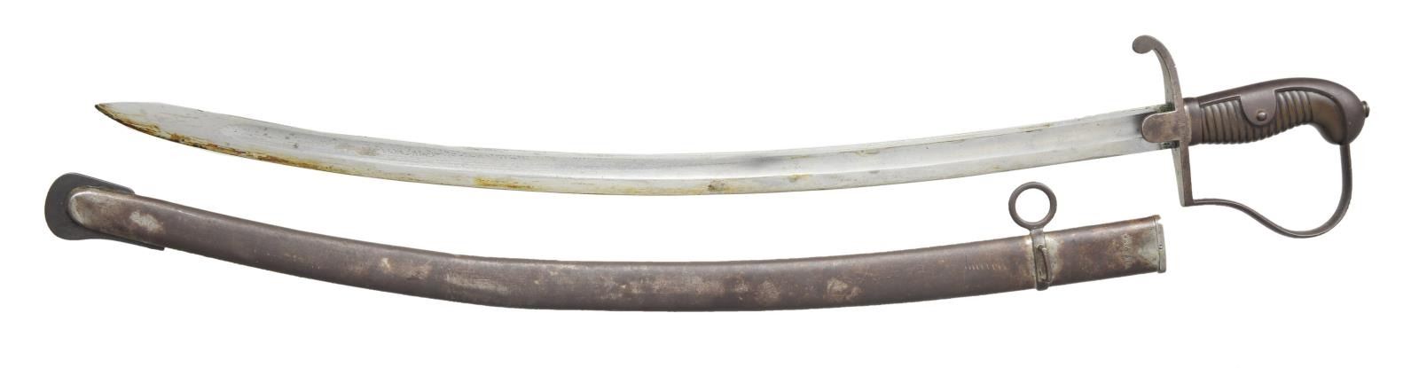 3) ARTILLERY. Overall length: 36”. Blade length: 29 3/4". Plain blade has a single wide fuller with inspector’s marks on the spine. Iron hilt regimentally marked on the crossguard. Reverse P guard with ears on the backstrap. Ribbed composite grip iron scabbard. CONDITION: blade has a light gray patina. Hilt and scabbard have a dark oxidized patina. Grip is undamaged. Scabbard has a few minor shallow dents. (02-16433-3/BF). $700-1000.