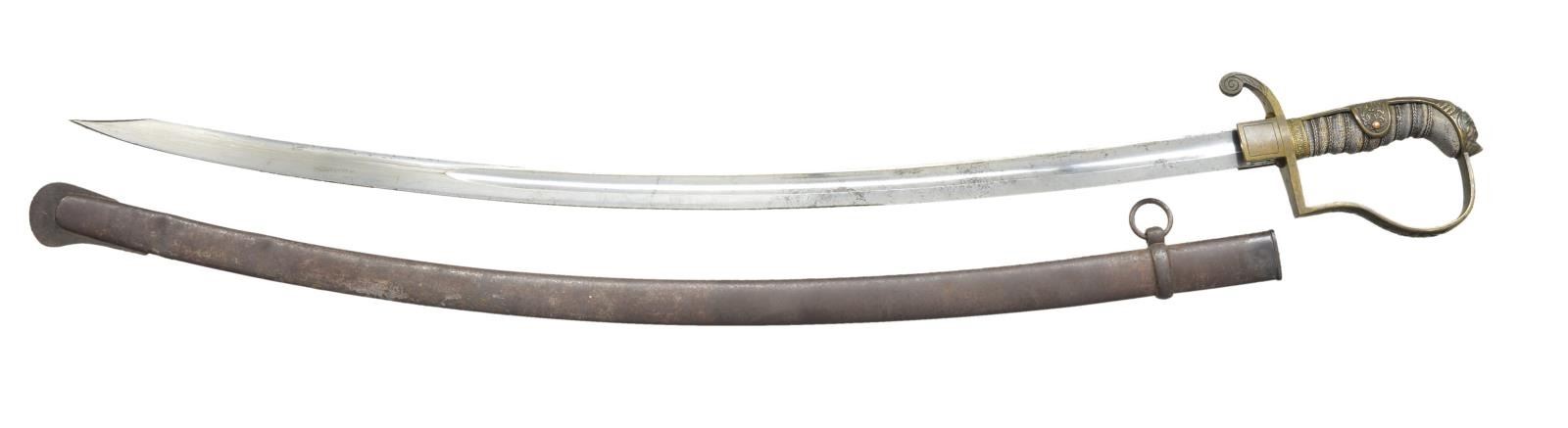 2) ARTILLERY. Overall length: 40”. Blade length: 33”. A clipped point blade with a single wide fuller. Ricasso is stamped “ALEX COPPEL SOLINGEN”. Gilded brass hilt with square languets. The front languet features crossed cannons. The knuckle bow and backstrap are embellished with foliate and classical motifs. The pommel is the shape of a lion’s head. Wire wrapped sharkskin grip. Iron scabbard. CONDITION: blade has a lightly mottled gray patina and has been sharpened. Hilt shows traces of original gilded finish with the balance having a deep mustard patina. Grip is complete and shows light to moderate wear. Scabbard has an oxidized finish with 2 notable dents near the drag.