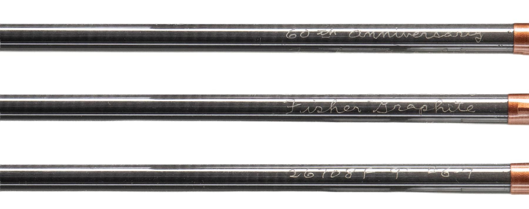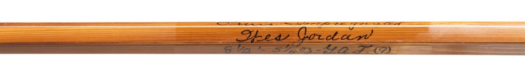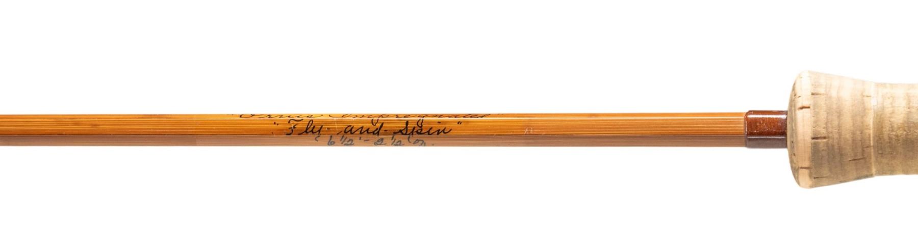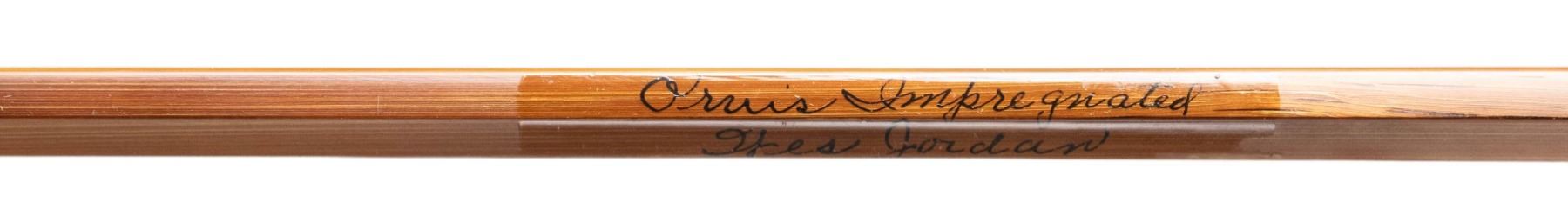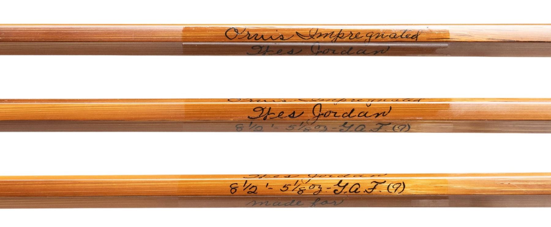 1) Orvis "Wes Jordan" bamboo fly rod. S# 62057. 8-1/2', 2 piece, 2 tips, 7 weight, walnut reel seat, end cap engraved G.E.E., marked "Orvis Impregnated" "Wes Jordan" "8 1/2' 5-1/8 oz., G.A. F. (7)" "Made for" "Jerard E. Evans", with non-original bag, leather covered tube as well as new storage tube. CONDITION: fine. Lightly used. Grip modified; cut for thumb and palm. 2) Orvis bamboo fly/spinning rod. S# 49506. 6-1/2', 2 piece, 1 tip, marked "Orvis Impregnated" "Fly and Spin" "6-1/2' 2-1/2 oz" "H.D.G. (6)". In original bag and tube. CONDITION: fine. Showing light use. Handle darkened. 3) Fisher graphite fly rod. 2 piece, 1 tip, marked "60th Anniversary" "Fisher Graphite" "26708F 9' #6-7" with bag and tube. CONDITION: very good. Handle dark. PROVENANCE: From the Private Collection of Berrien Moore III. (02-25866-1/MGM). $400-750.