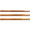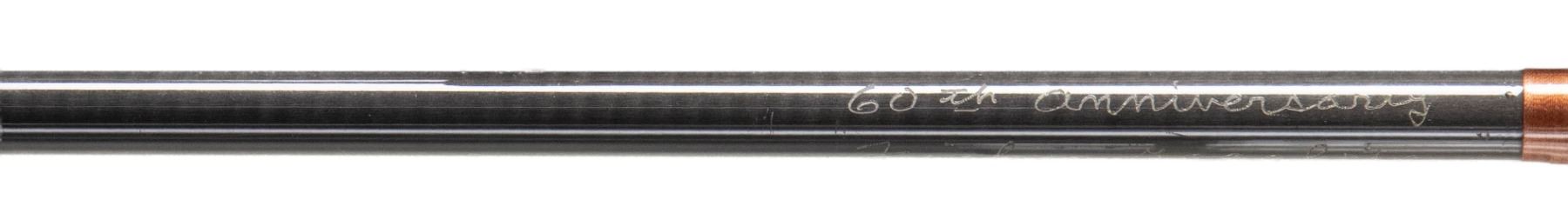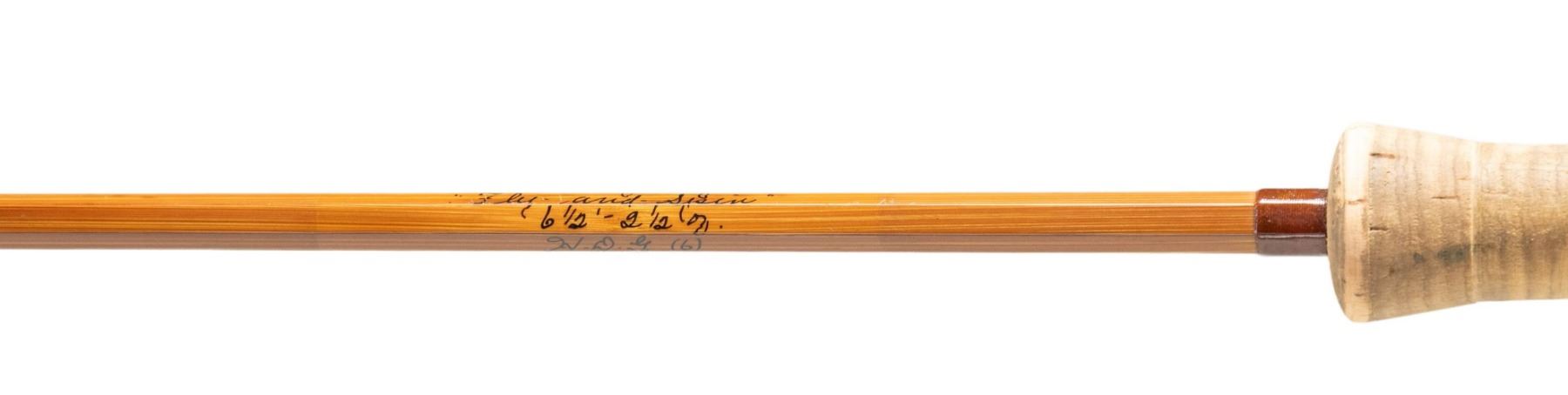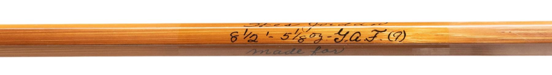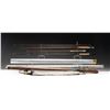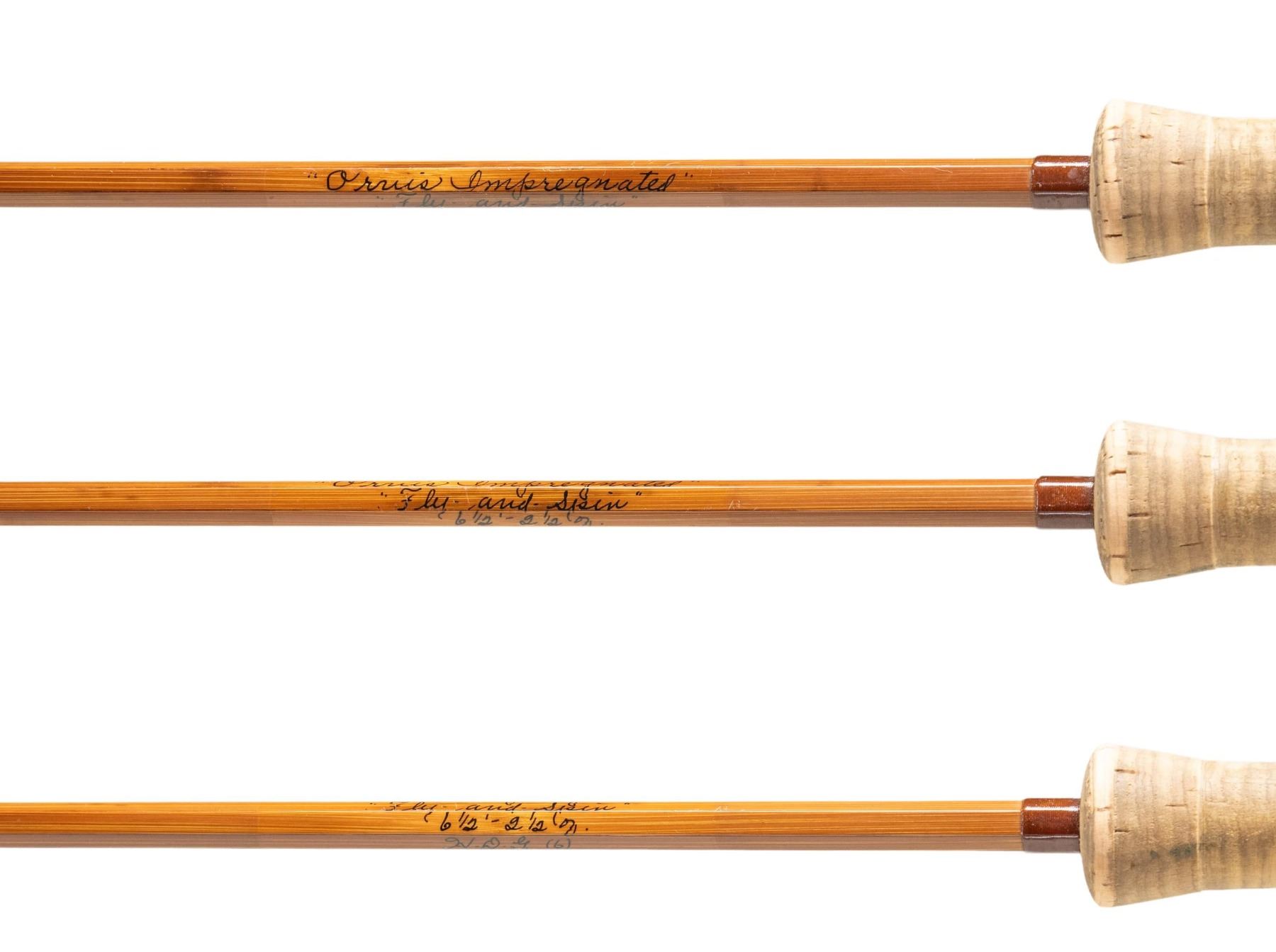 1) Orvis "Wes Jordan" bamboo fly rod. S# 62057. 8-1/2', 2 piece, 2 tips, 7 weight, walnut reel seat, end cap engraved G.E.E., marked "Orvis Impregnated" "Wes Jordan" "8 1/2' 5-1/8 oz., G.A. F. (7)" "Made for" "Jerard E. Evans", with non-original bag, leather covered tube as well as new storage tube. CONDITION: fine. Lightly used. Grip modified; cut for thumb and palm. 2) Orvis bamboo fly/spinning rod. S# 49506. 6-1/2', 2 piece, 1 tip, marked "Orvis Impregnated" "Fly and Spin" "6-1/2' 2-1/2 oz" "H.D.G. (6)". In original bag and tube. CONDITION: fine. Showing light use. Handle darkened. 3) Fisher graphite fly rod. 2 piece, 1 tip, marked "60th Anniversary" "Fisher Graphite" "26708F 9' #6-7" with bag and tube. CONDITION: very good. Handle dark. PROVENANCE: From the Private Collection of Berrien Moore III. (02-25866-1/MGM). $400-750.
