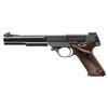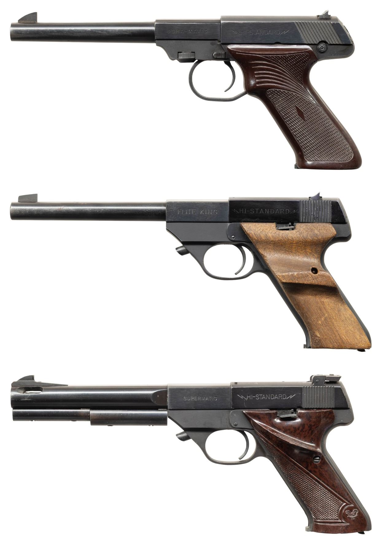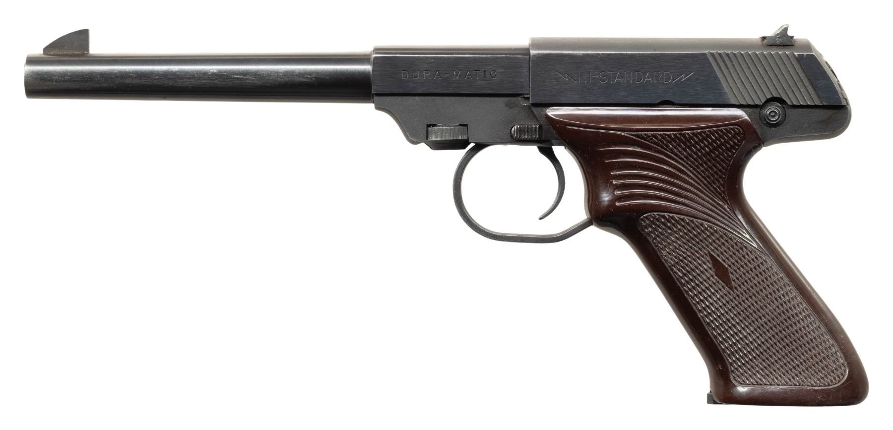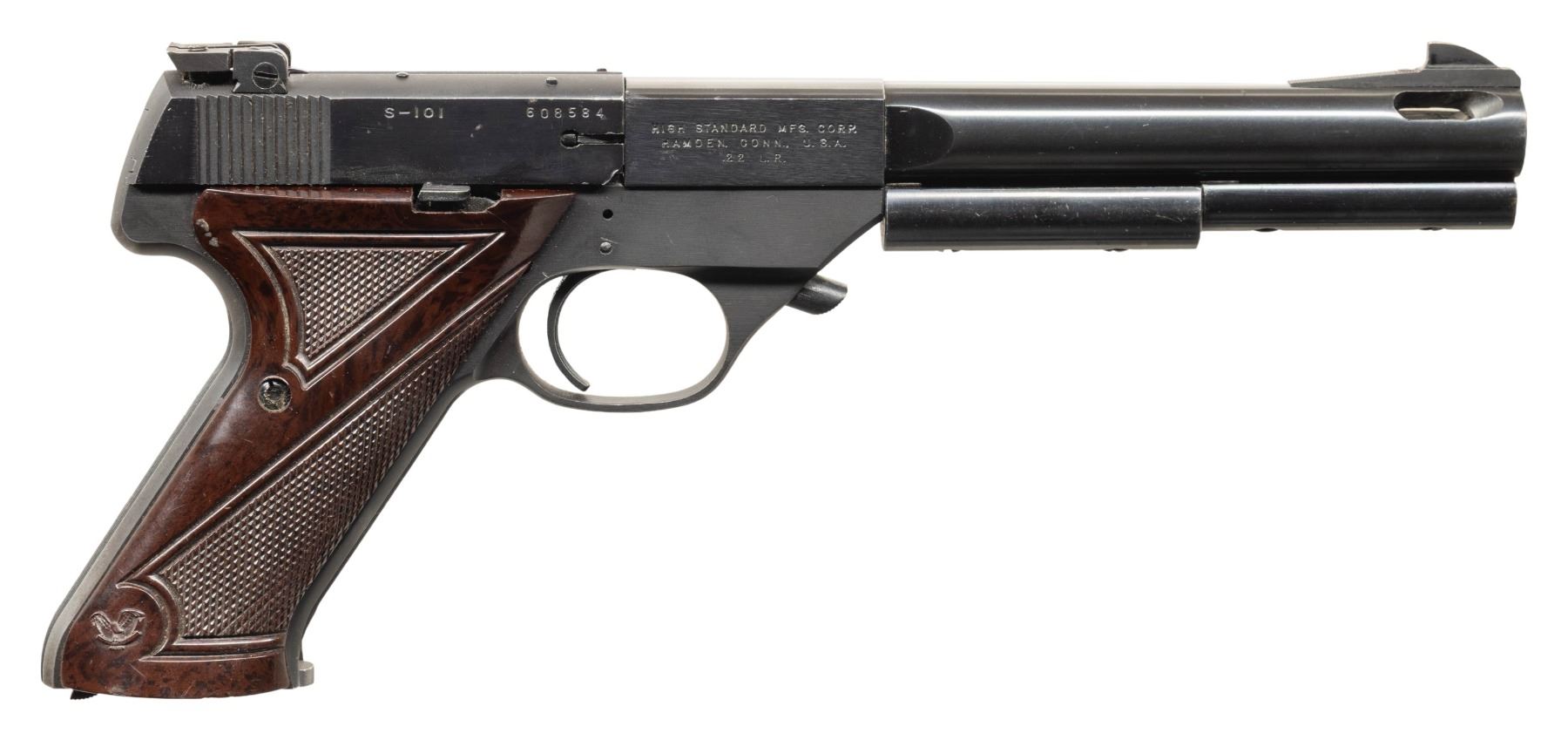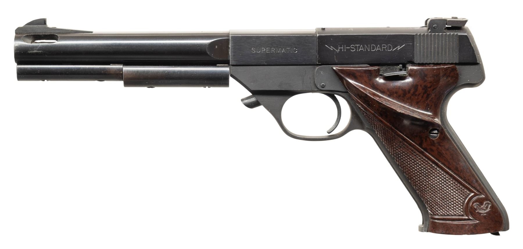 3) S-101 SUPERMATIC. S# 608584 (on frame under slide). Mfg. 1956. Ported 6.75" bbl. w/ 2 added barrel weights. Blade front sight & adj. rear sight. Brown plastic thumb rest grips. MAGS: 1 in the white 10 rd. CONDITION: very good blue with patina along backstrap. Very good grips. Very good rifling. (25-5387/MD). ALL CURIO. $600-900.
