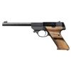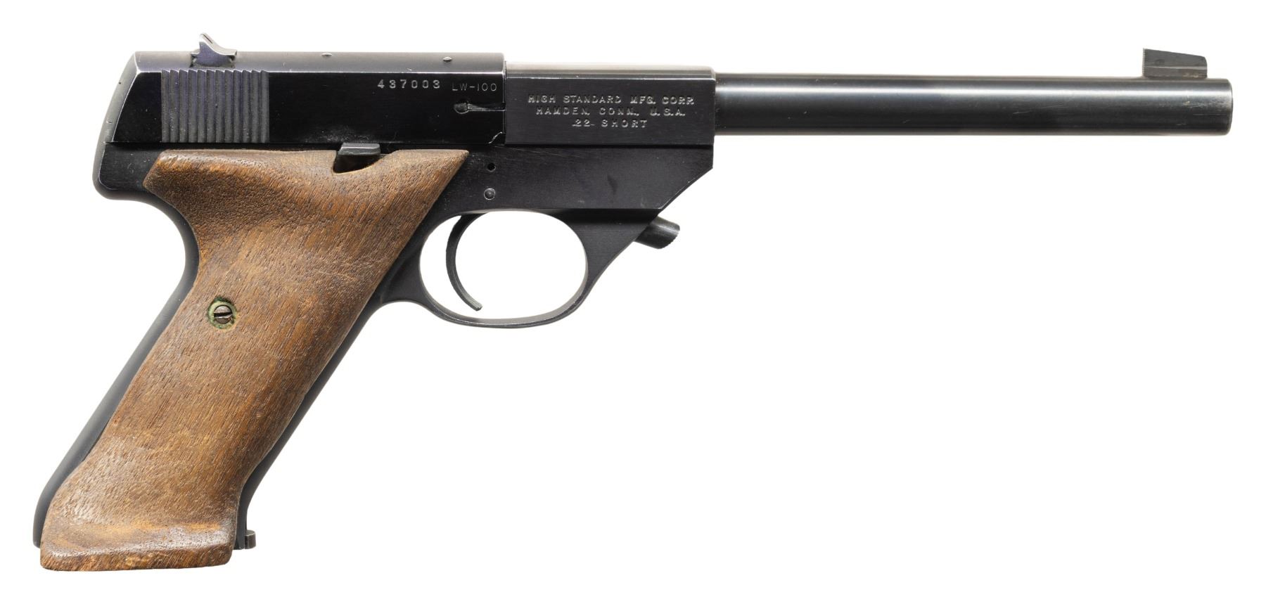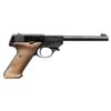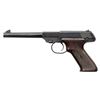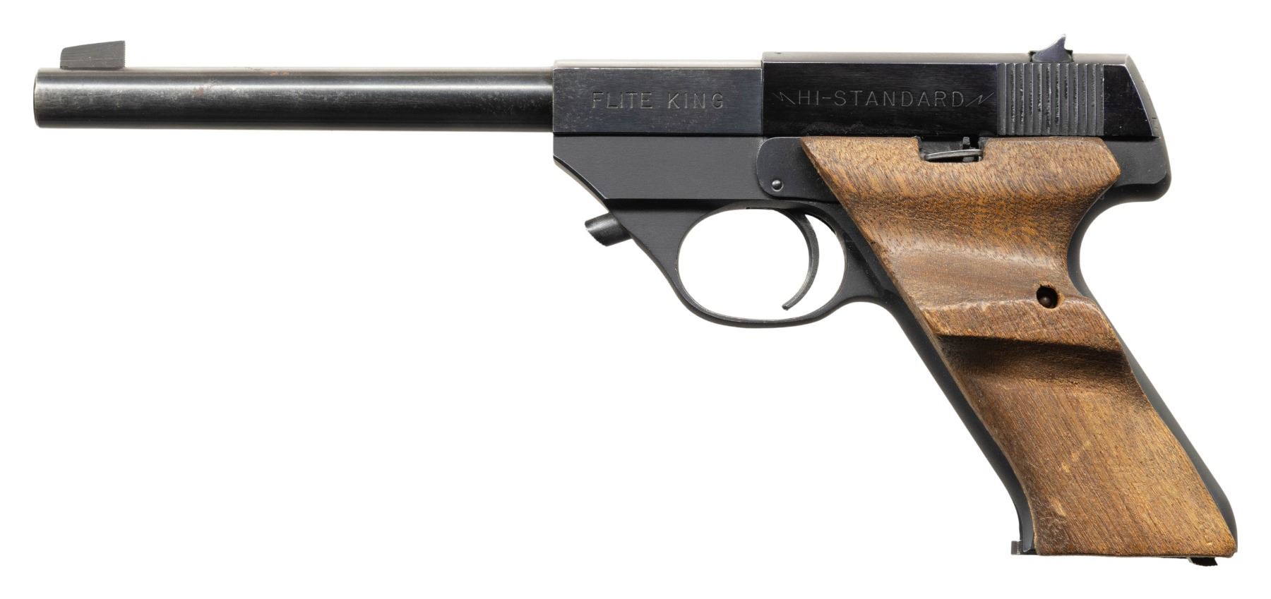 2) LW-100 FLITE KING. S# 437003 (on frame under slide). Mfg. 1953. Bbl. 6.75". Fixed sights. Hobbyist made thumb rest wood grips. MAGS: 1 - 10 rd. CONDITION: good blue with spots of oxidation & wear. Fair wood finish. Very good rifling. (25-5381/MD).