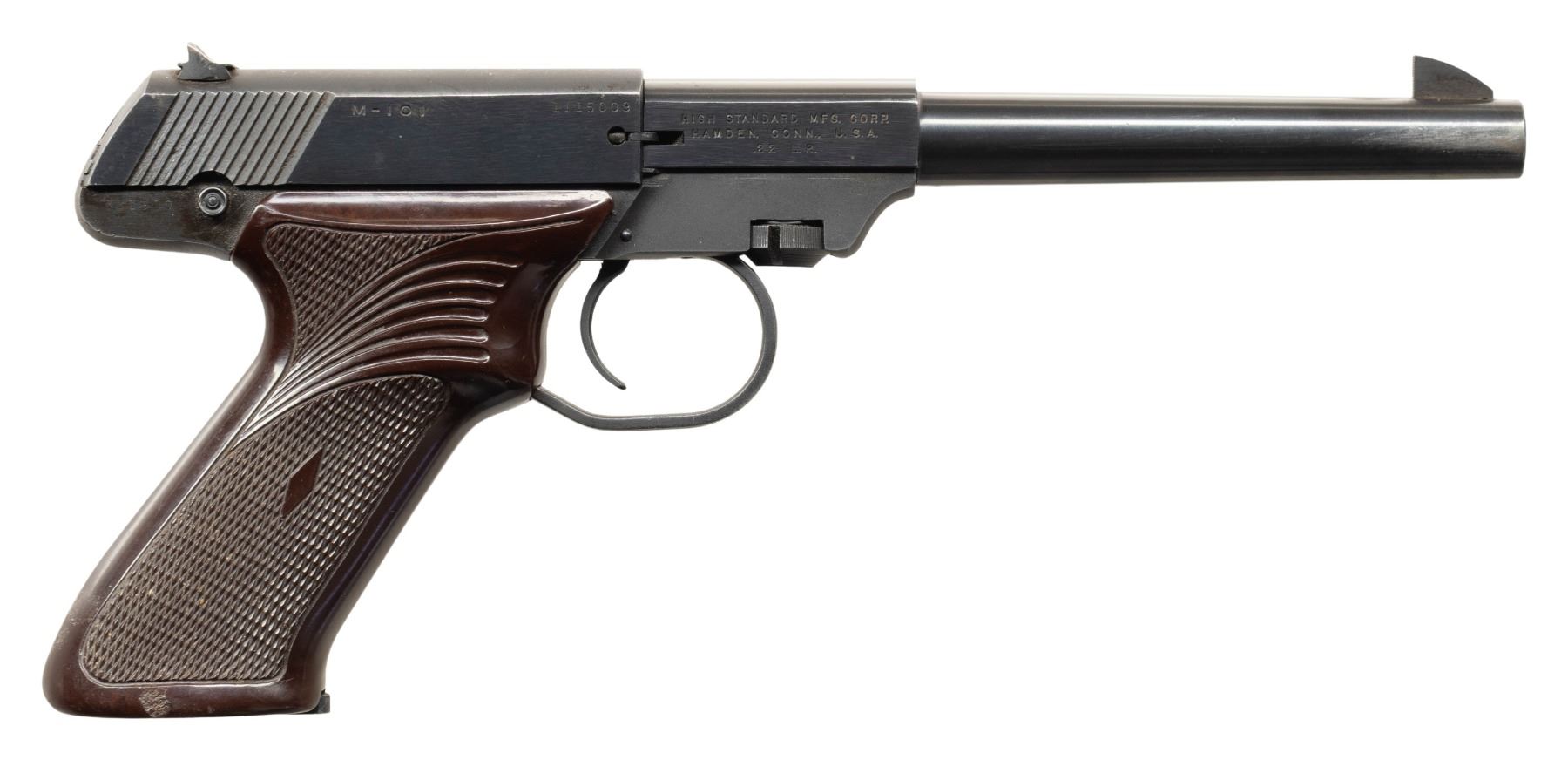 1) M-101 DURAMATIC S# 1115009. Mfg. 1960. Bbl. 6.5". Blade front sight & notch rear sight. Brown plastic grips. MAGS: 1 - 10 rd. CONDITION: good blue with muzzle wear & peppery oxidation. Very good grips. Very good rifling. (25-5380/MD).