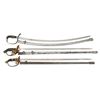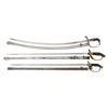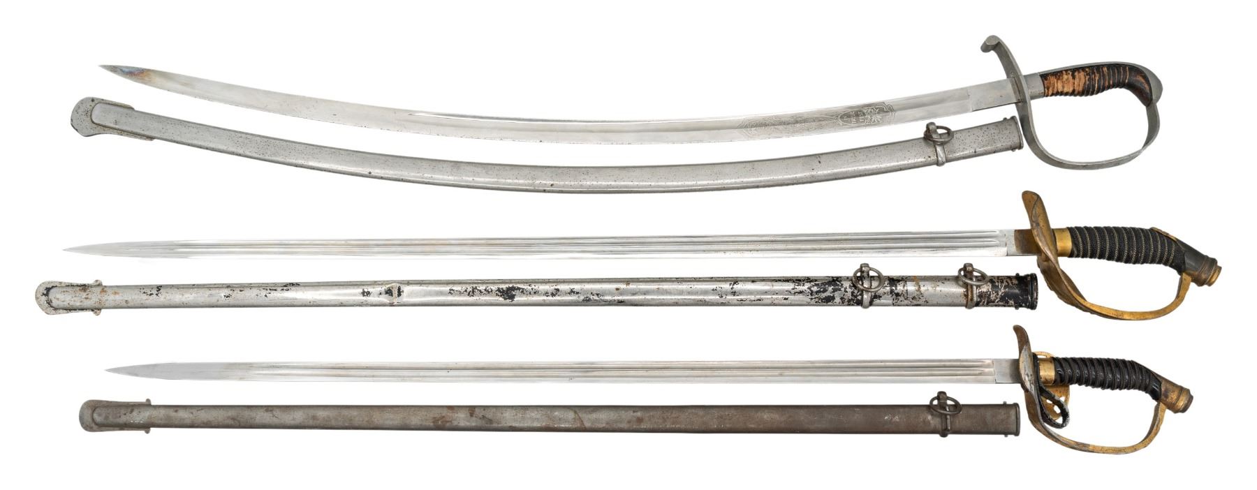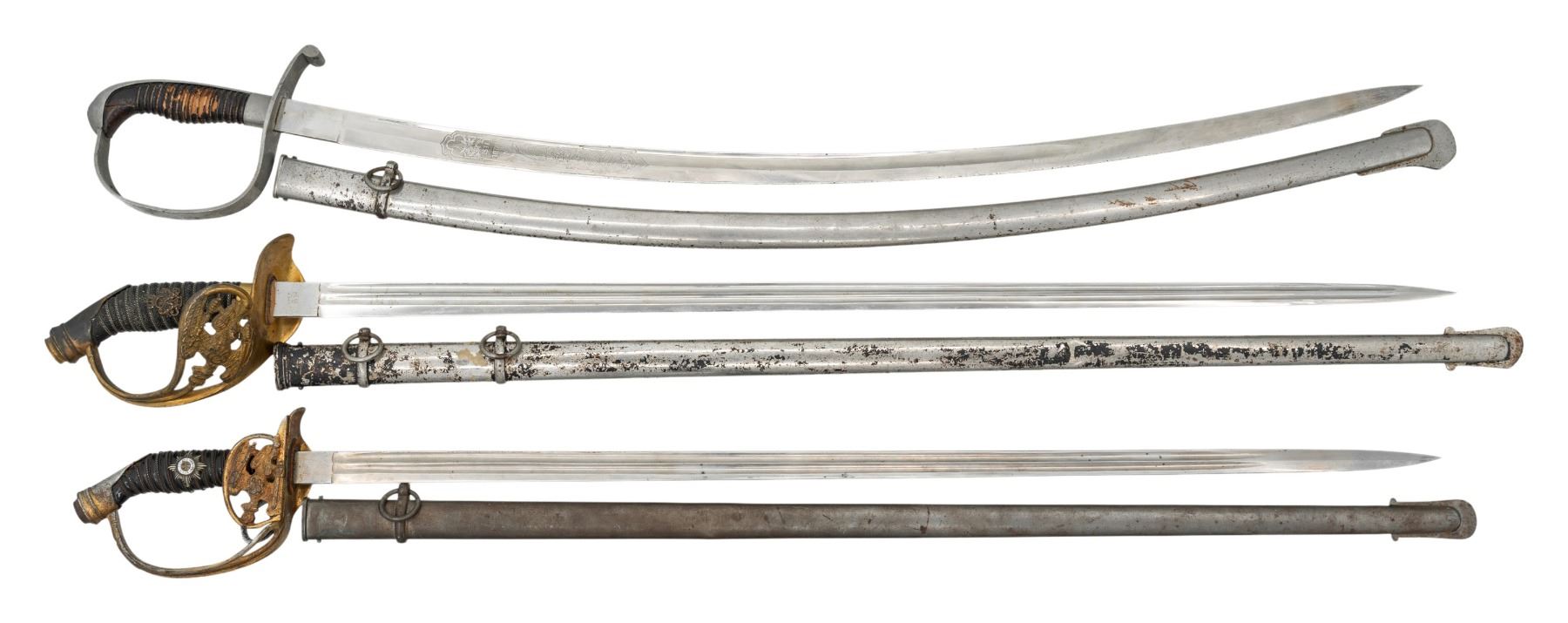 1) Imperial German officer's sword measuring 41 1/2" overall with a plain double fullered blade marked "(logo) W. K. & C.". Gilded brass hilt with a cutout Prussian eagle in the non-folding guard. Wire wrapped shark skin grip with a royal cipher on the front. Plated scabbard. CONDITION: blade has a good finish with a little peppery oxidation. Hilt shows light wear with 75% of the gilded finish remaining. Plated scabbard has some heavy tarnish and one dent. 2) Imperial German officer's sword measuring 38 1/2" overall with a plain double fullered unmarked blade. Gilded brass hilt with a cutout Prussian eagle in the folding guard. Wire wrapped composite grip with an enameled star on the front that reads "SUUM CUIQUE" hearkening back to the Prussian Order of the Black Eagle from 1701. Steel scabbard. CONDITION: blade has a good finish with light gray patina. Hilt shows wear with 50% of the gilded finish remaining. Scabbard has a dark oxidized finish. 3) Imperial German Bavarian officer's sword measuring 39" overall with an etched double fullered blade marked "(logo) C. K. Co.". The etching includes a goddess on each side and the words "IN TREUE FEST". Plain plated hilt with leather covered wooden grip. Plated scabbard. CONDITION: blade has a good finish but has several nicks to the edge. Hilt and scabbard show light wear with touches of oxidation. Grip has lost about 30% of its leather covering. (02-25787/BF). NON-GUN. $700-1,000.