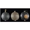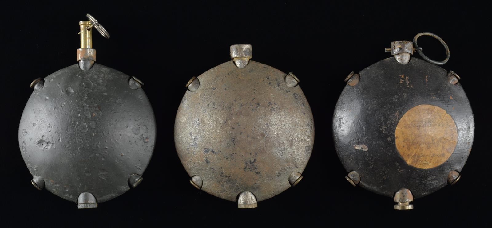 These grenades are made of 2 steel places crimped together w/ 4 internal rods. The grenades were designed to be thrown like a frisbee having centrefugal force on the rods to prime the grenade & explode upon contact, rather than time delay. These 3 grenades have different exterior painted finish w/out any noticeable markers marks. One has correct appearing pin & cap, one has cap plugged & 1 has replacement plug. CONDITION: fair condition commensurate w/ age w/ wear, scuffing & oxidation. (02-16257/MD). $250-500.